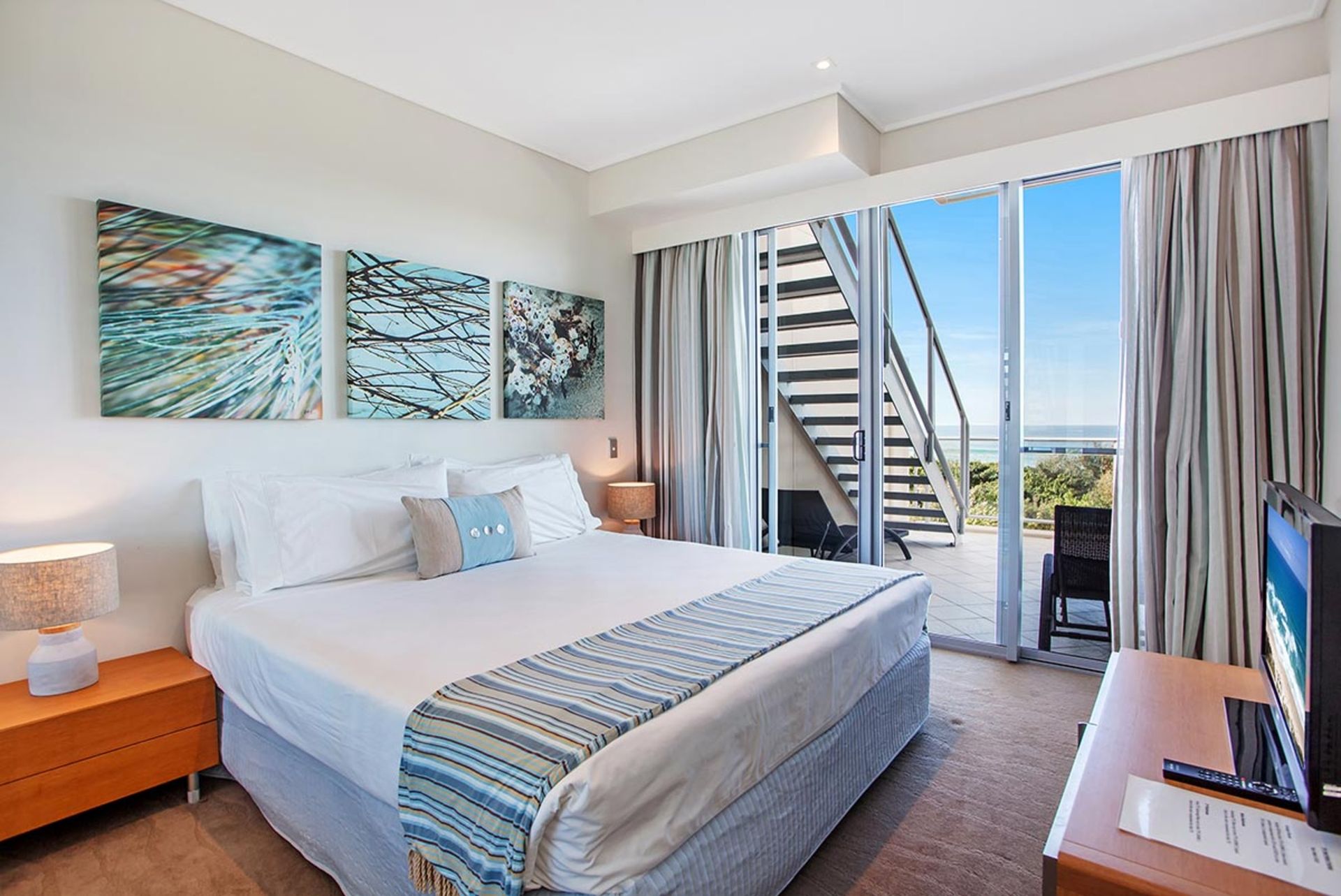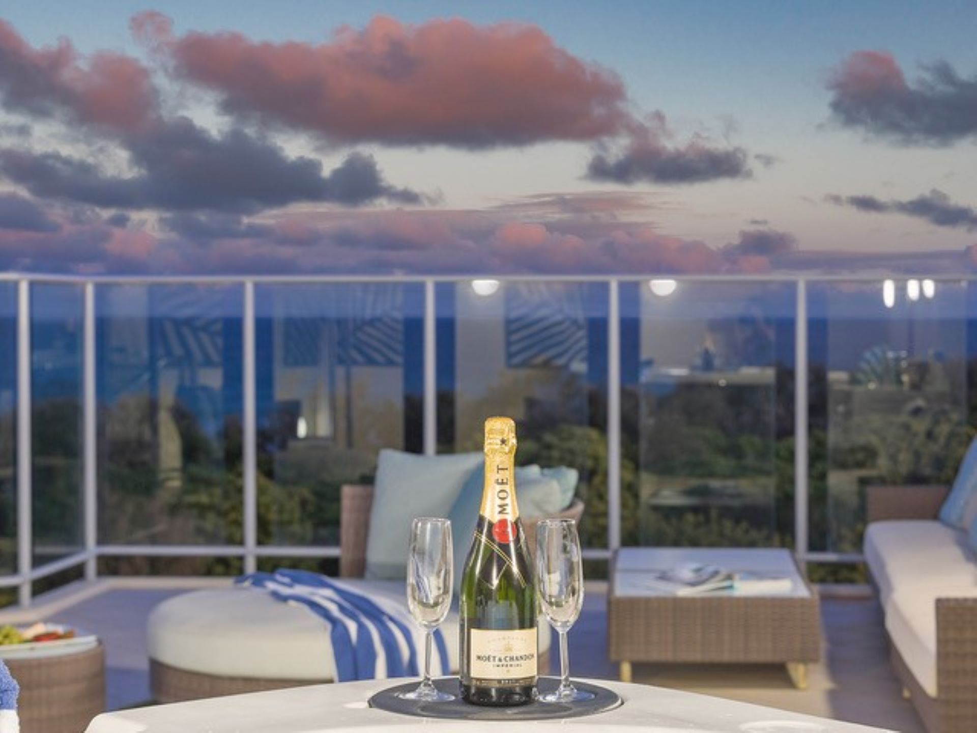 The open style living area and gourmet kitchen with stainless steel Miele appliances, and wine fridge will make entertaining easy. Our Kitchen is equipped with a Nespresso Coffee Machine and Nespresso Coffee Pods and a selection of Tea. Your spacious balcony overlooks the blue ocean and you can enjoy romantic evenings watching the stunning sunsets.