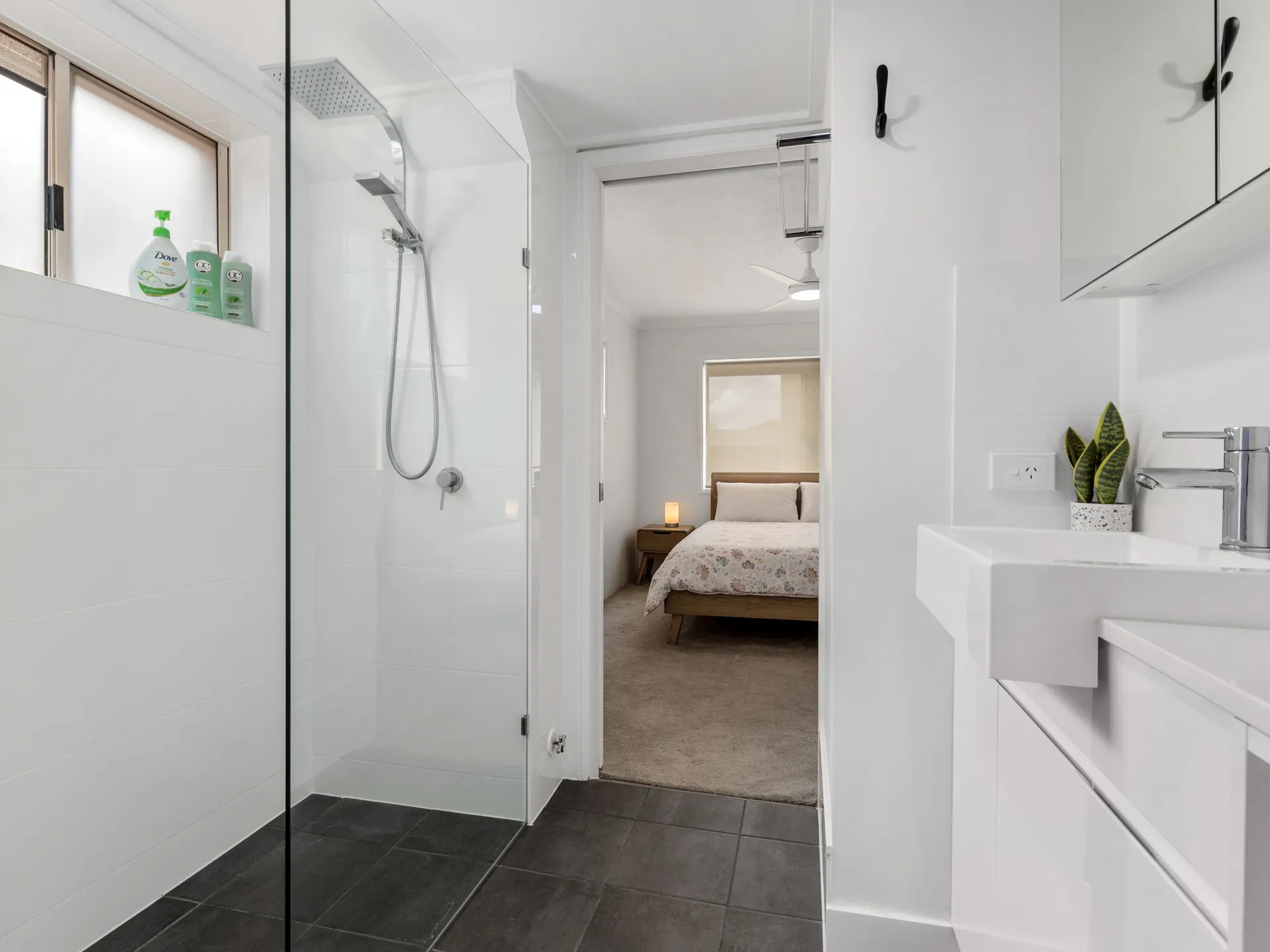 Your master suite features a Queen size bed, ceiling fan, built in robe with access to the main bathroom which consists of a shower, vanity, washing machine and separate toilet.