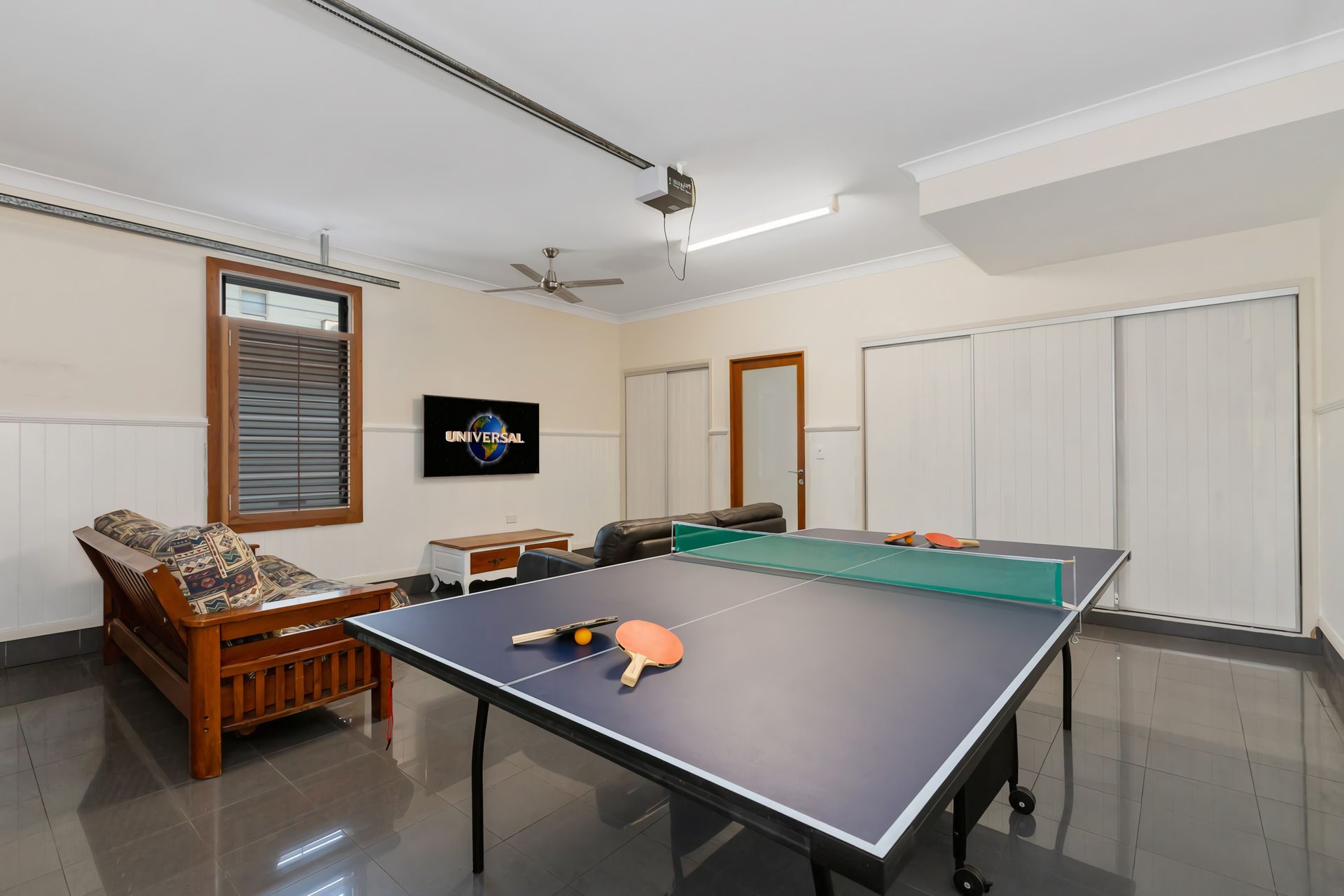 The garage has been converted to a kids hangout spot equipped with a ping pong table, flat screen TV, ceiling fan and lounges.