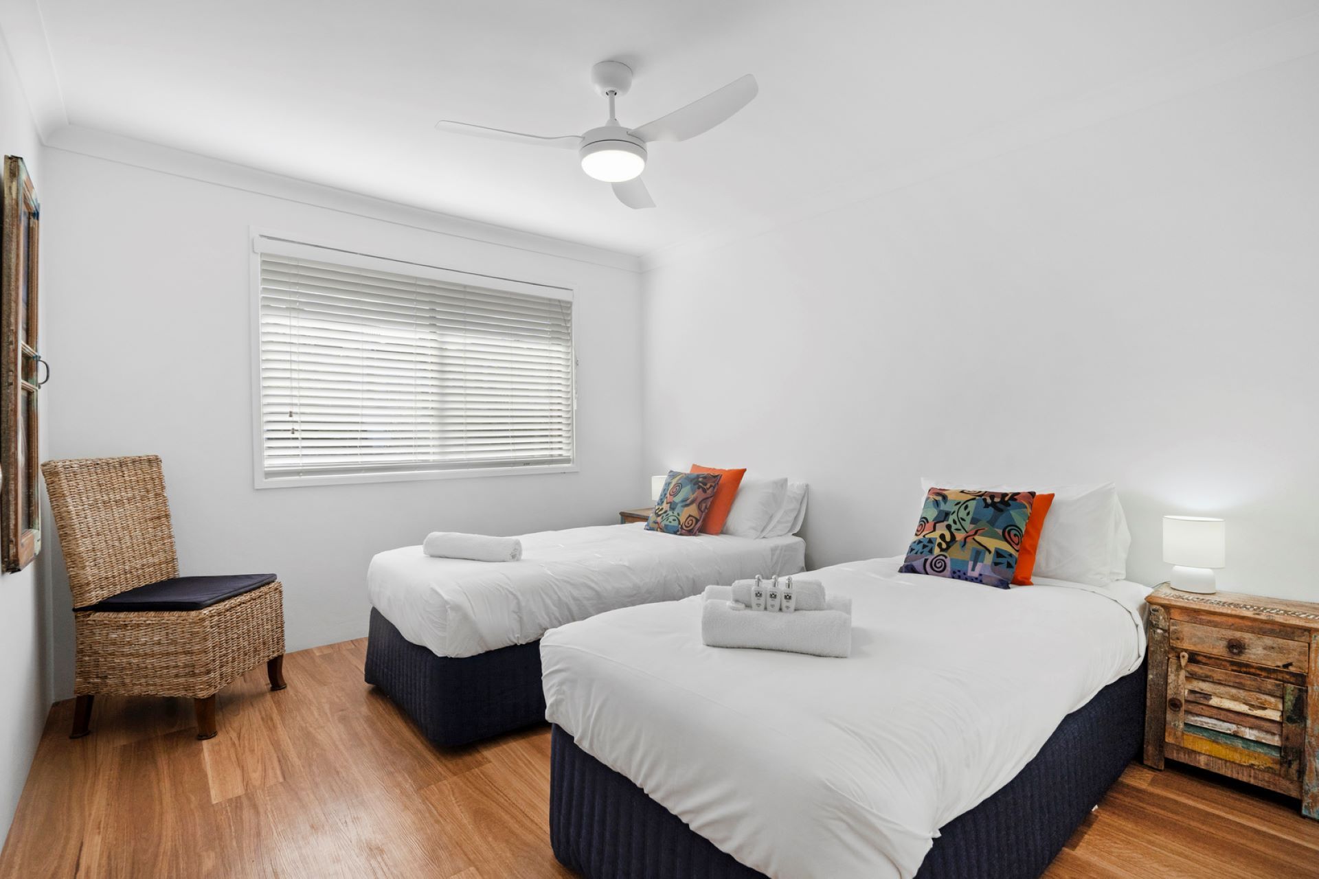 The master bedroom has A Queen bed and a ceiling fan. Bedroom 2 has 2 Single beds and a ceiling fan.