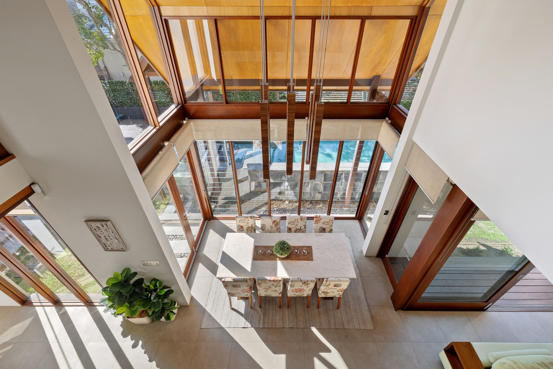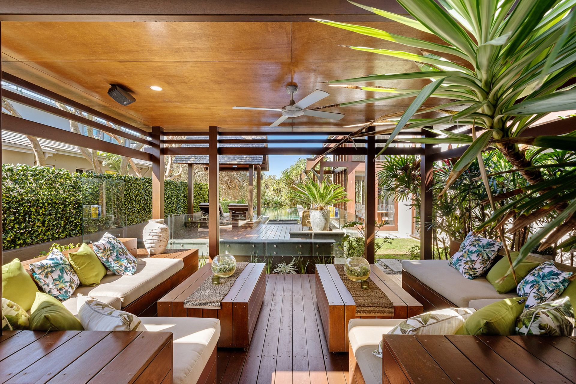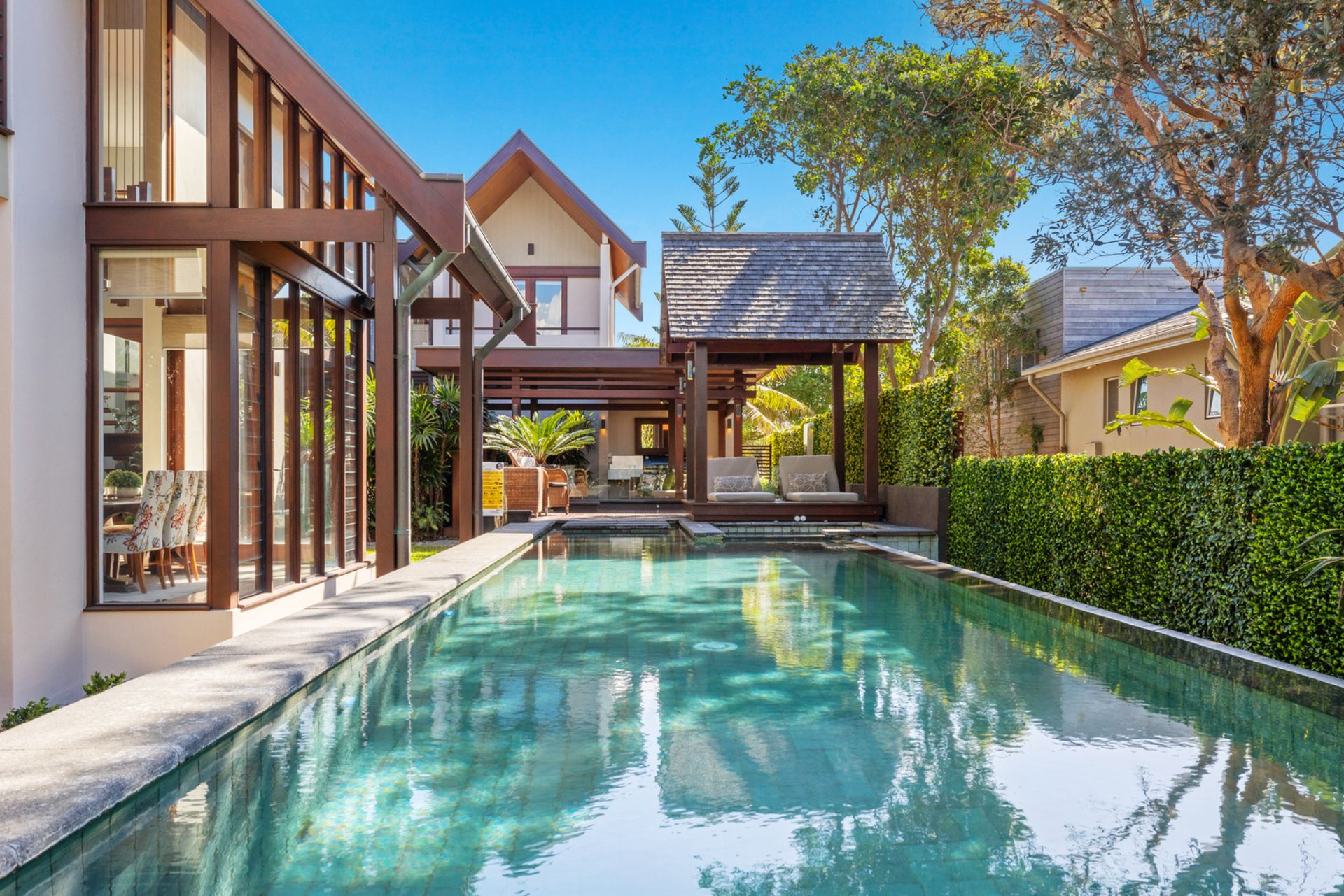 A garden entertaining setting plus dining table allows you to enjoy poolside dining. Enjoy a barbecue cooked meal under the covered cabana area which overlooks the exquisite infinity pool.