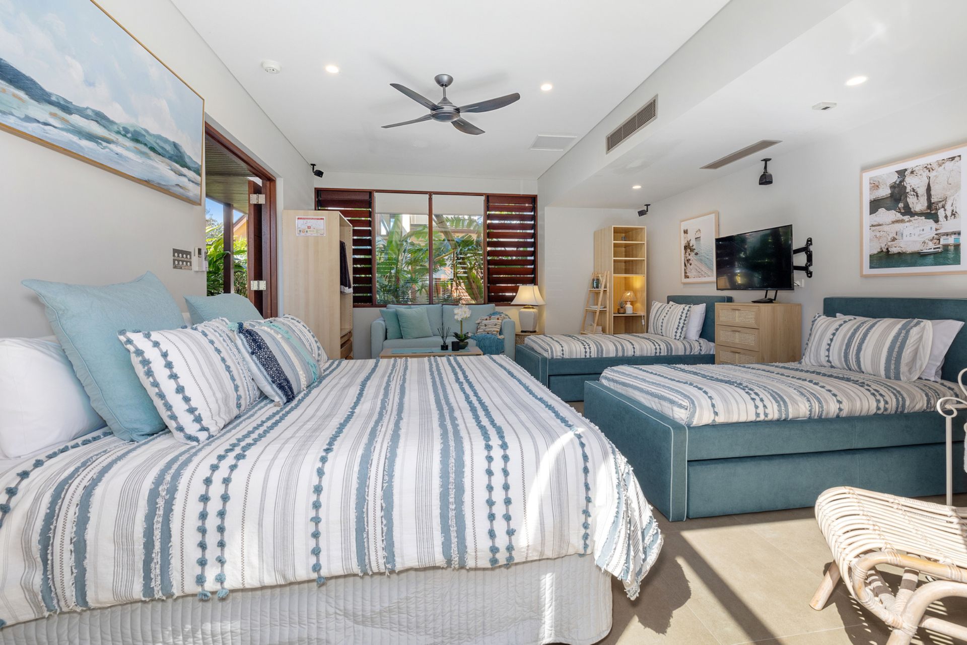 Your open plan living area includes ceiling to floor glass bi-folding doors and windows allowing natural light to surround the property but still allowing complete and total privacy created from the beautiful greenery. This area features a lounge suite, dining table, smart TV, gas fireplace, day bed and ducted air conditioning. Flowing seamlessly out onto the beach side deck area, which is covered and has a comfortable outdoor corner lounge and 2 Papasan tub chairs.