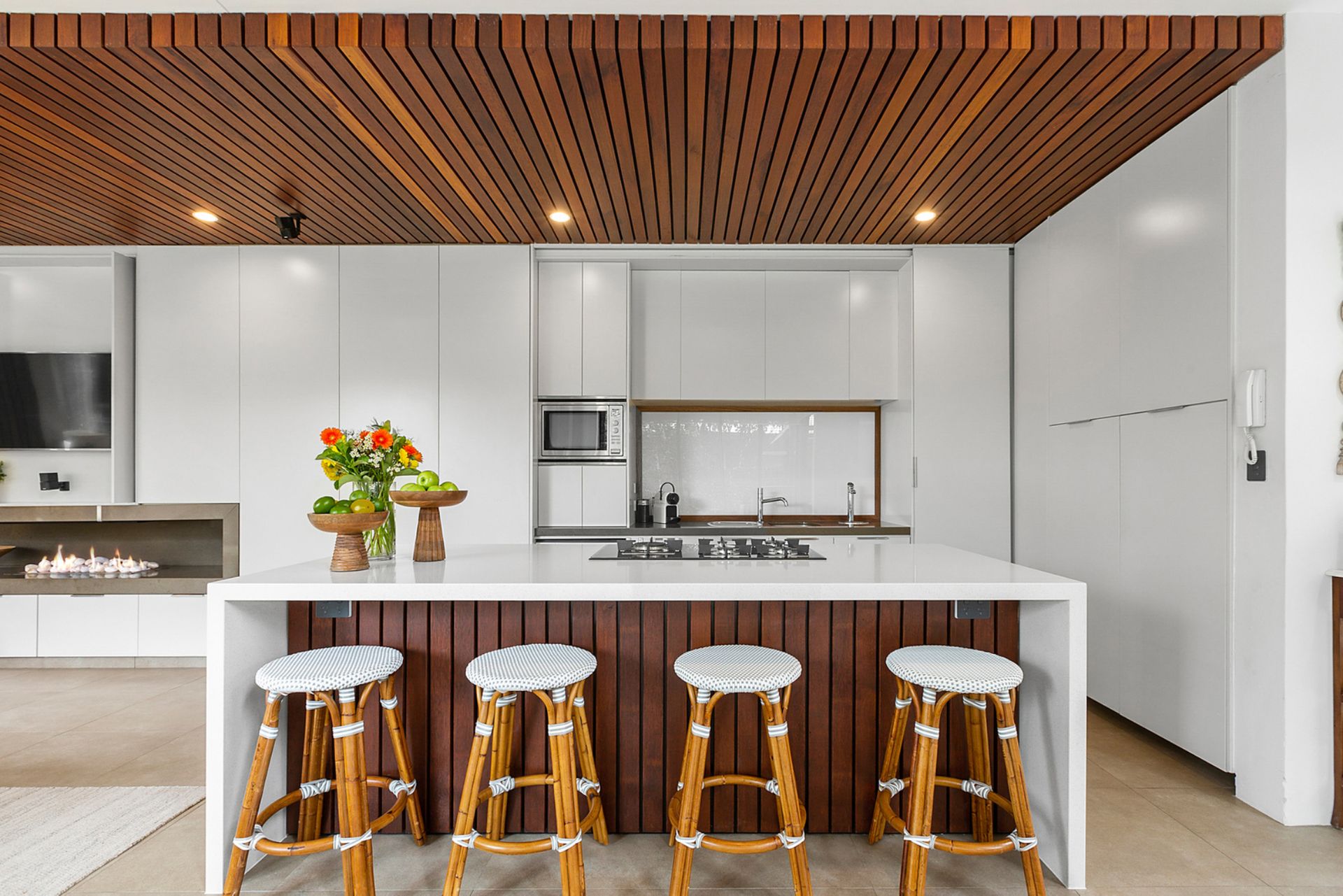 The kitchen is fully equipped with a gas cooktop, oven, dishwasher, integrated fridge, Nespresso coffee machine and breakfast bar.