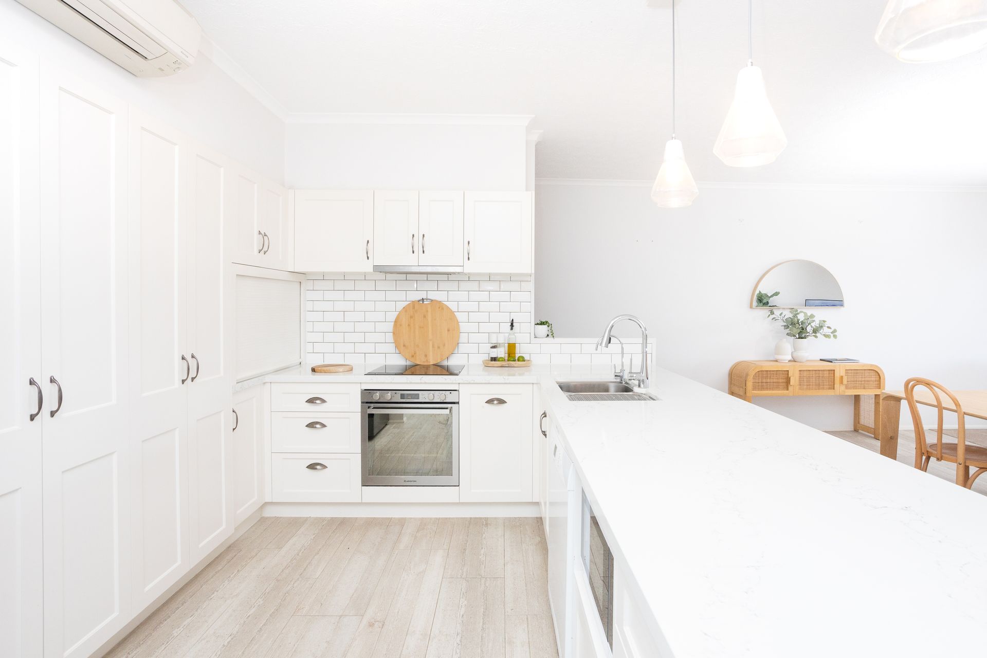The modern kitchen is completely equipped with all cookware, crockery, glassware, electric cooktop, dishwasher, oven, stainless steel fridge, breakfast bar and ample bench space.