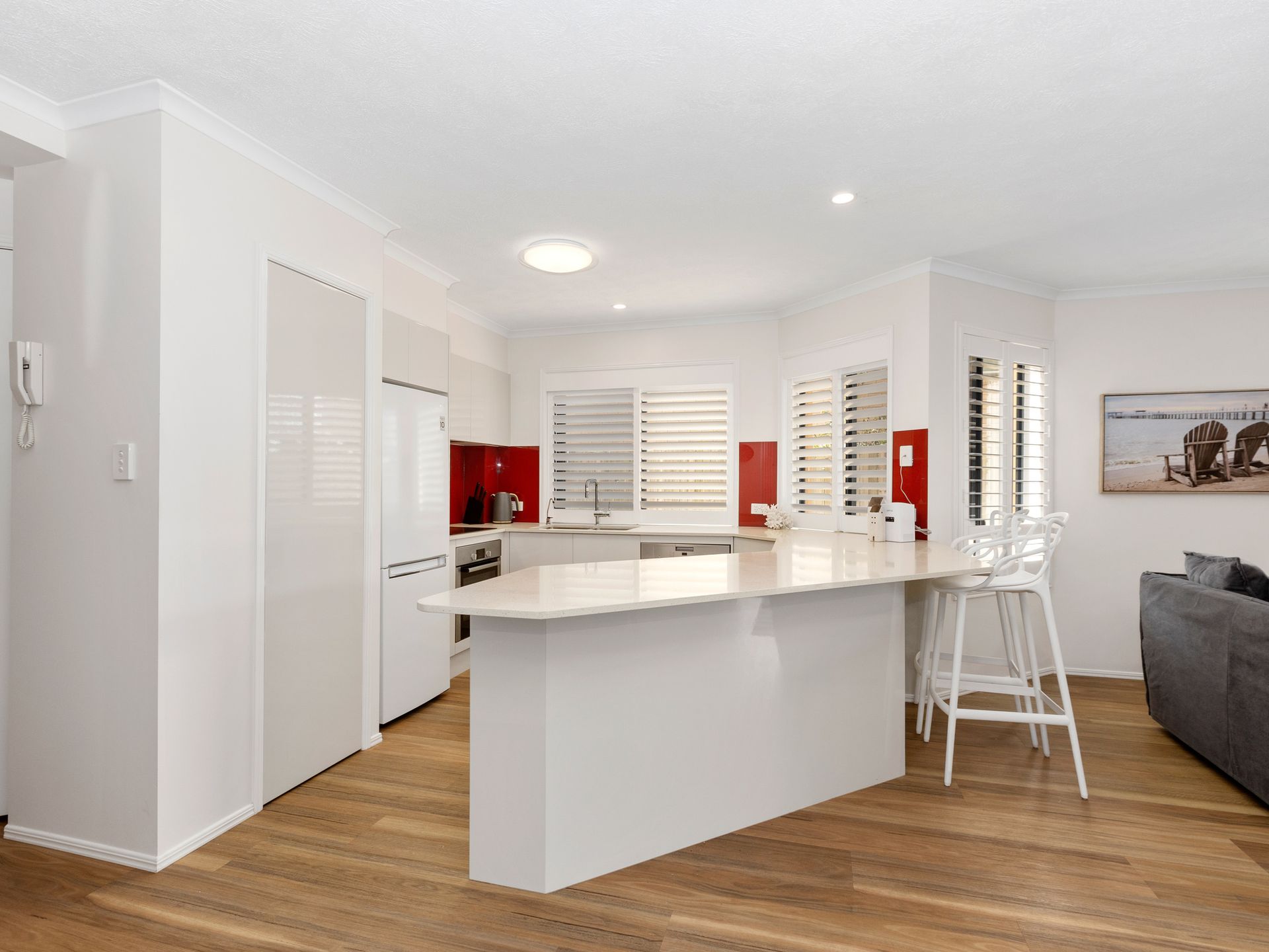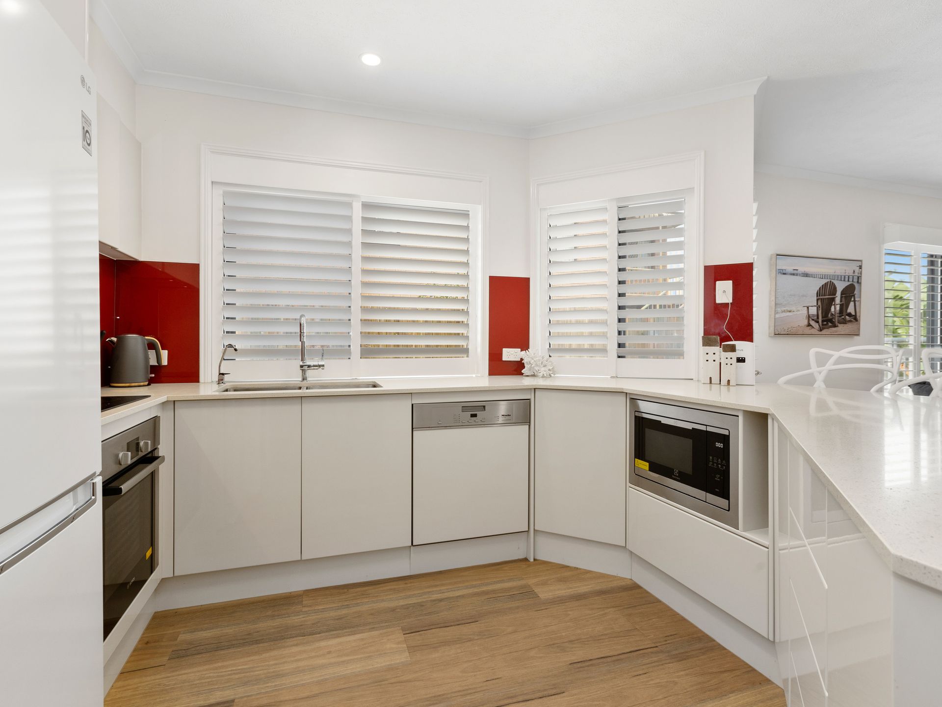 The kitchen is completely equipped with all cookware, crockery, glassware, sandwich press, coffee machine, oven, electric cooktop, fridge, microwave, breakfast bar and ample bench space.