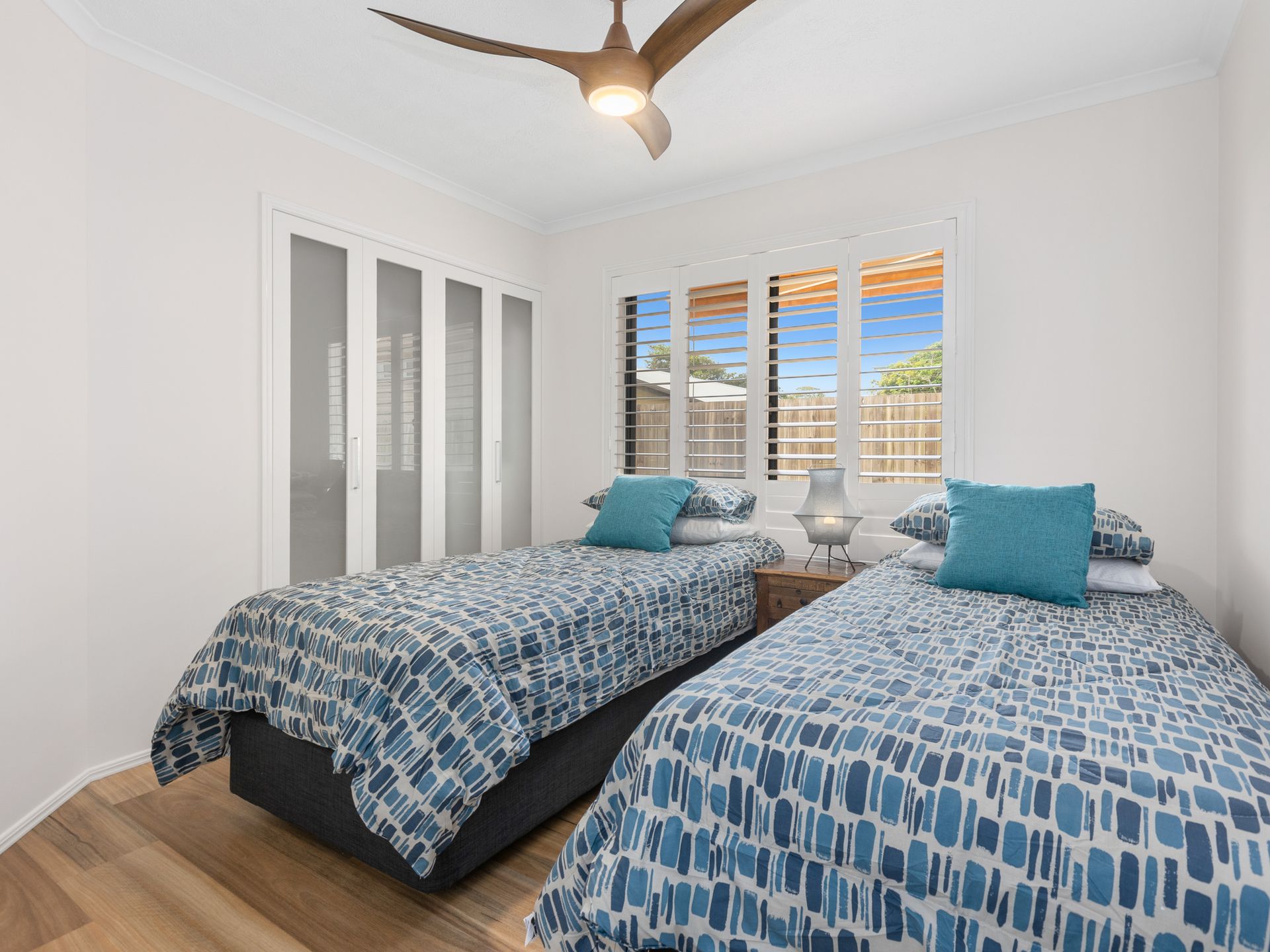 Bedroom 2 is set up with 2 Single beds which can be conjoined to make a King size bed upon request, ceiling fan- and built-in robe.