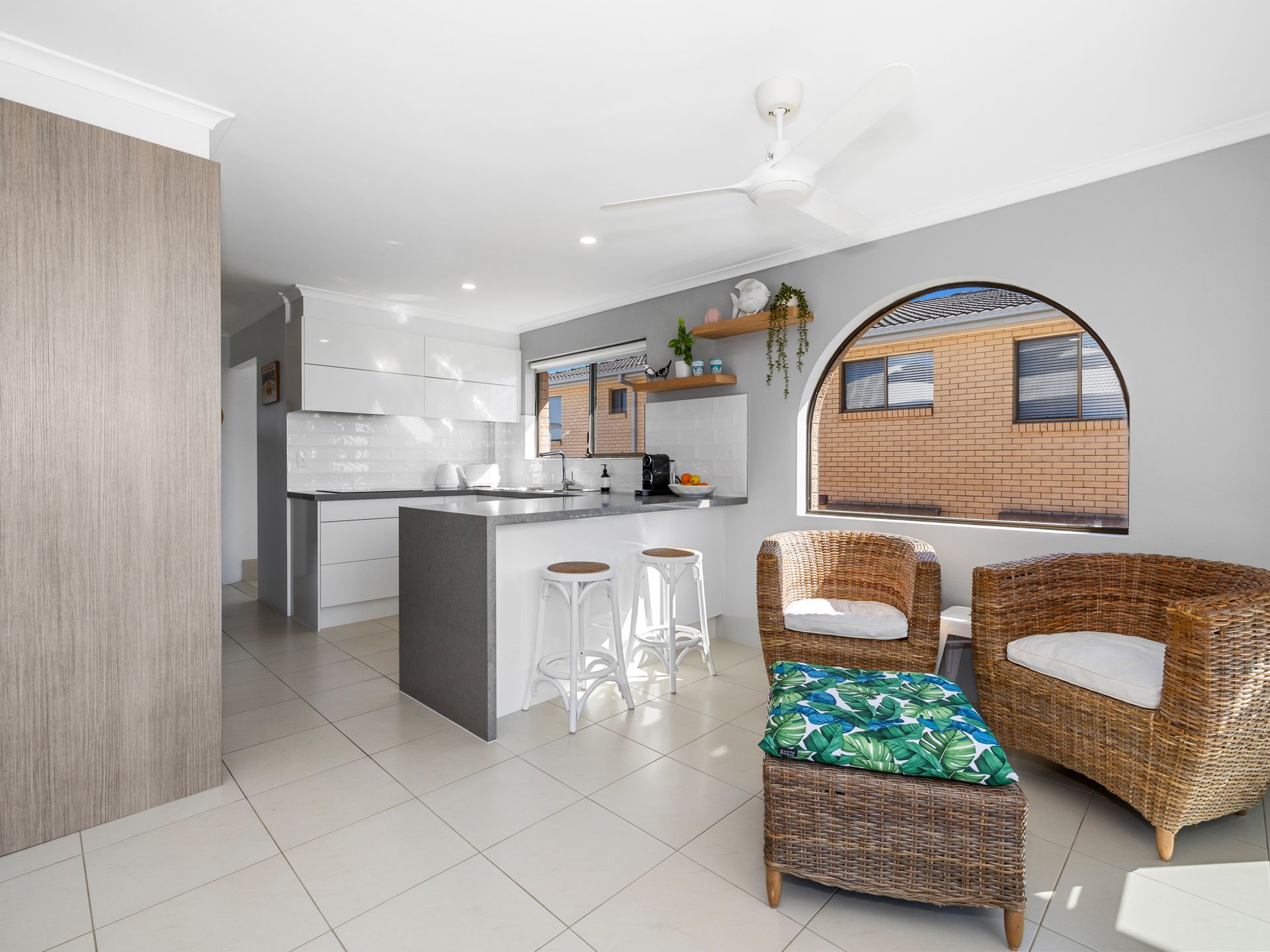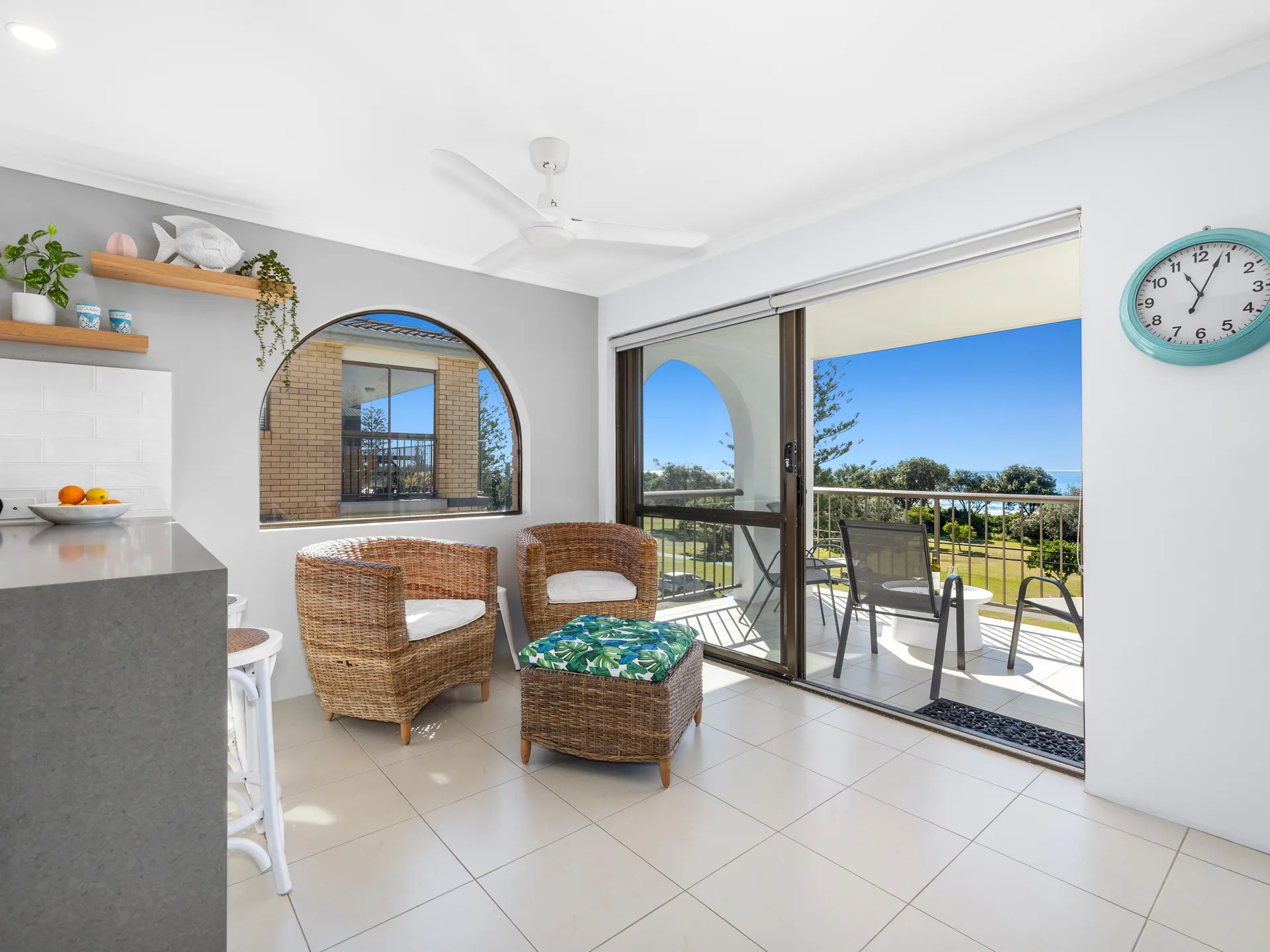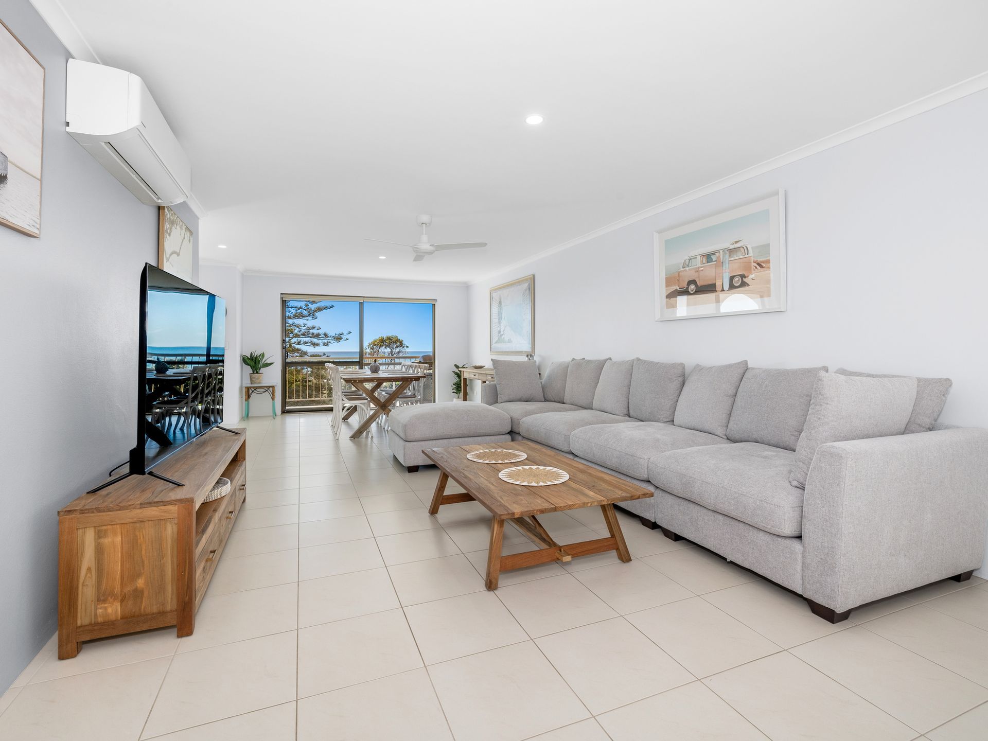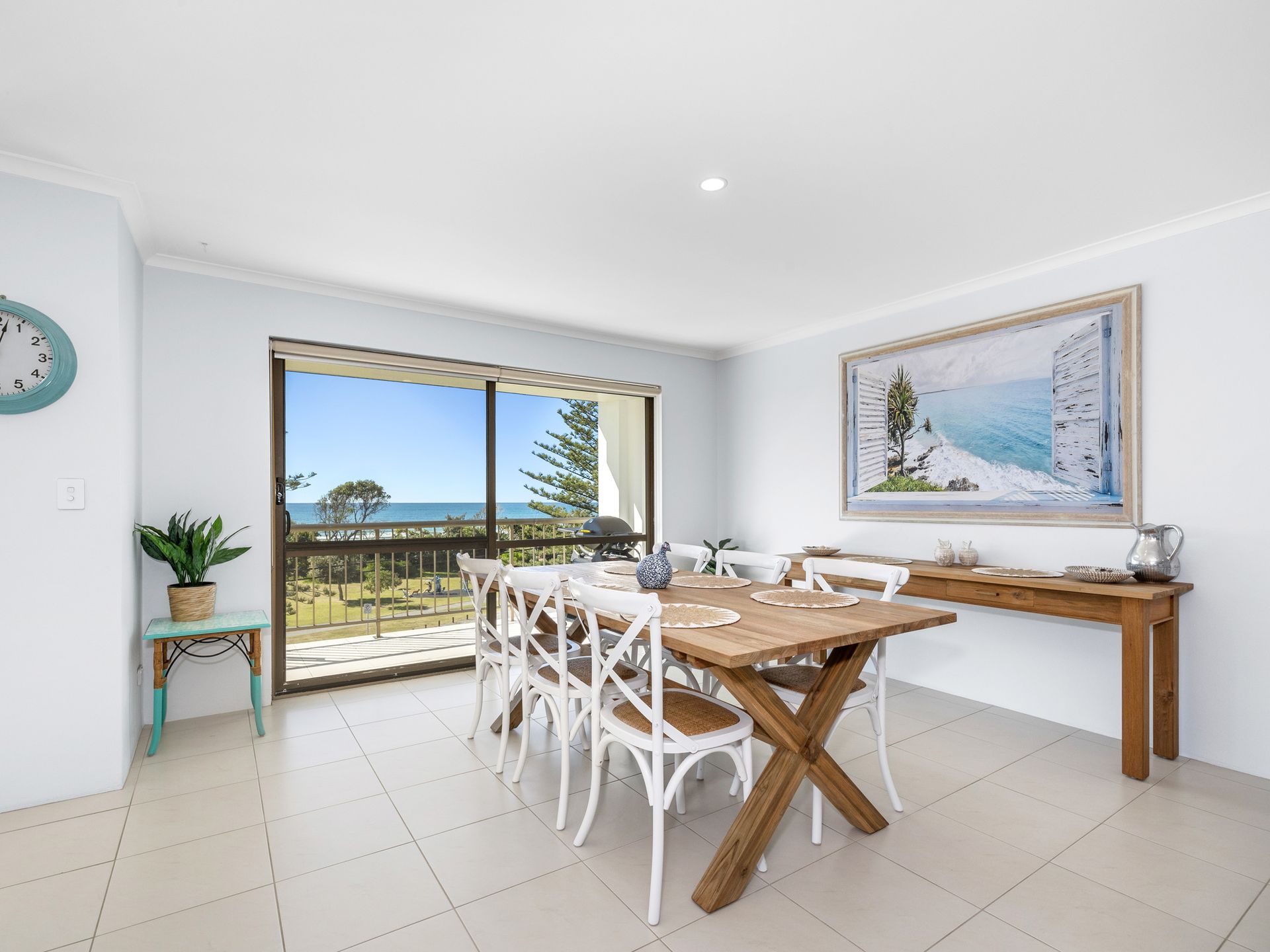 This renovated oceanfront apartment is beautifully furnished with all new furniture. The open plan living area features a comfortable lounge suite, smart TV, Air-conditioning, ceiling fans, and a 6-seater dining table. This area flows out onto the covered balcony, where you can enjoy a glass of bubbles whilst taking in the stunning views of the ocean - or rise early with your morning cuppa and enjoy the spectacular sunrises.
