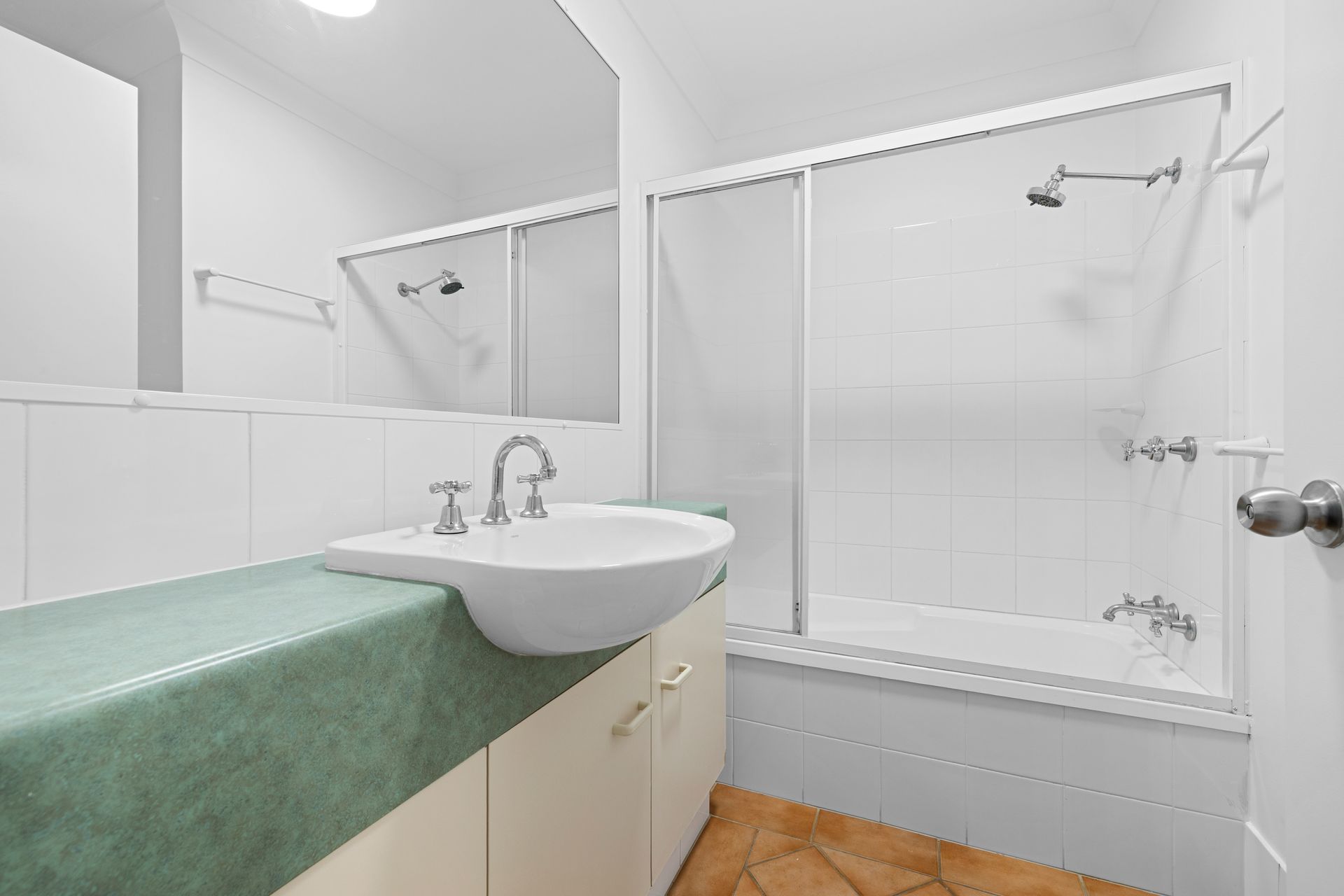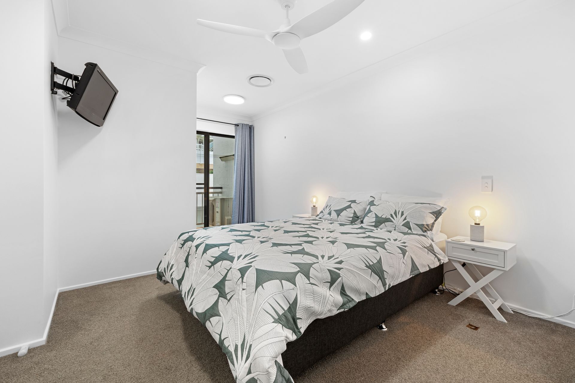 The master bedroom features a Queen bed, wall-mounted TV, walk-in robe and ensuite with shower and toilet. The second bedroom has 2 Single beds and access to the small private patio adjoining the master bedroom. The main bathroom also has a shower and toilet.