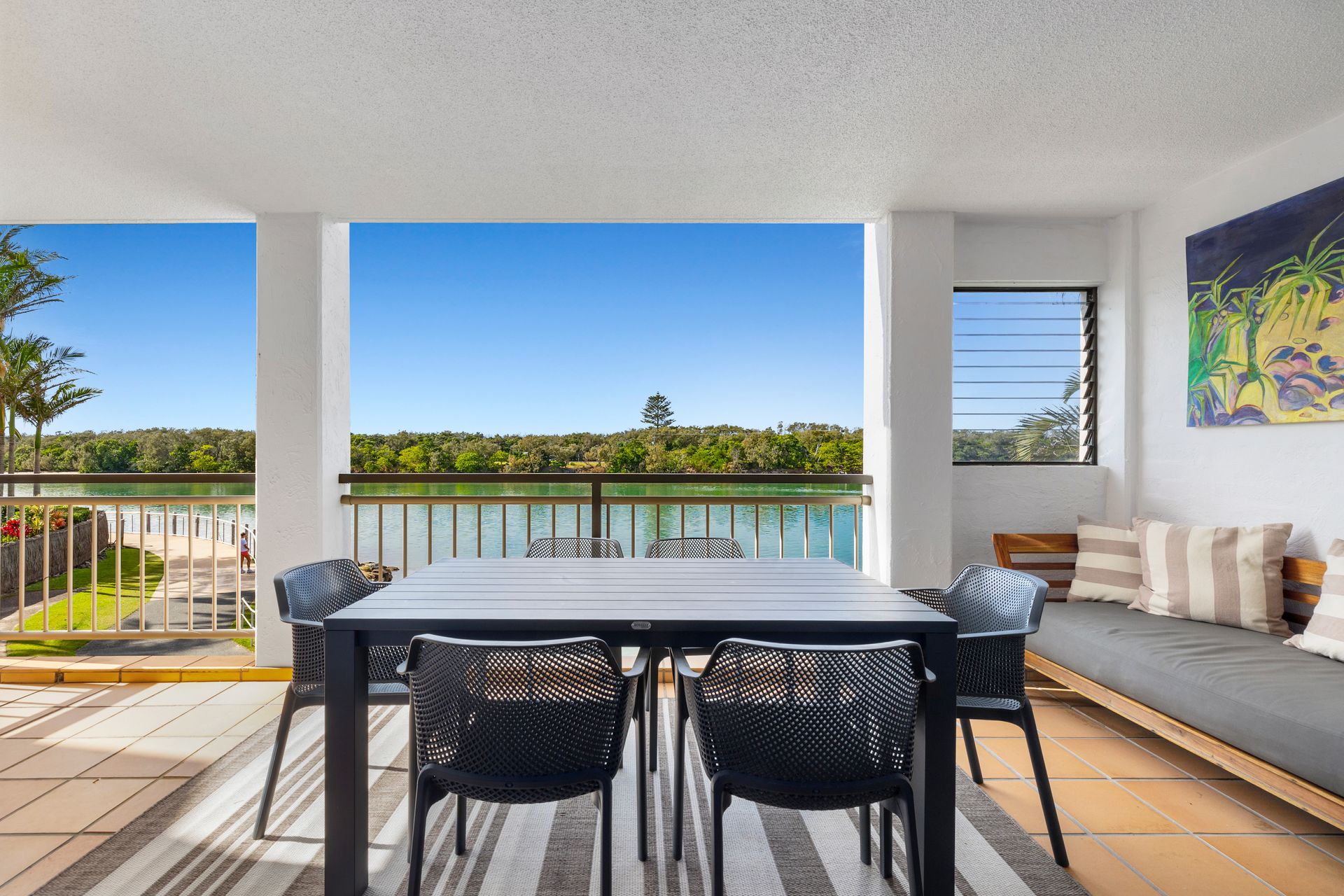 Step outside to find your own private slice of paradise. The creekfront location means you’re just moments away from all the activities you love – kayaking, fishing, or simply enjoying the peaceful surroundings. The communal pool is a short stroll from your door, offering a refreshing place to cool off and unwind in a beautifully landscaped setting. The undercover BBQ and sun loungers in the pool area provide you with a means to refuel and relax on your holiday. Walk through the secure gate to the boardwalk, perfect for a peaceful stroll to watch the wildlife and paddleboarders, or a scenic route to your morning coffee.