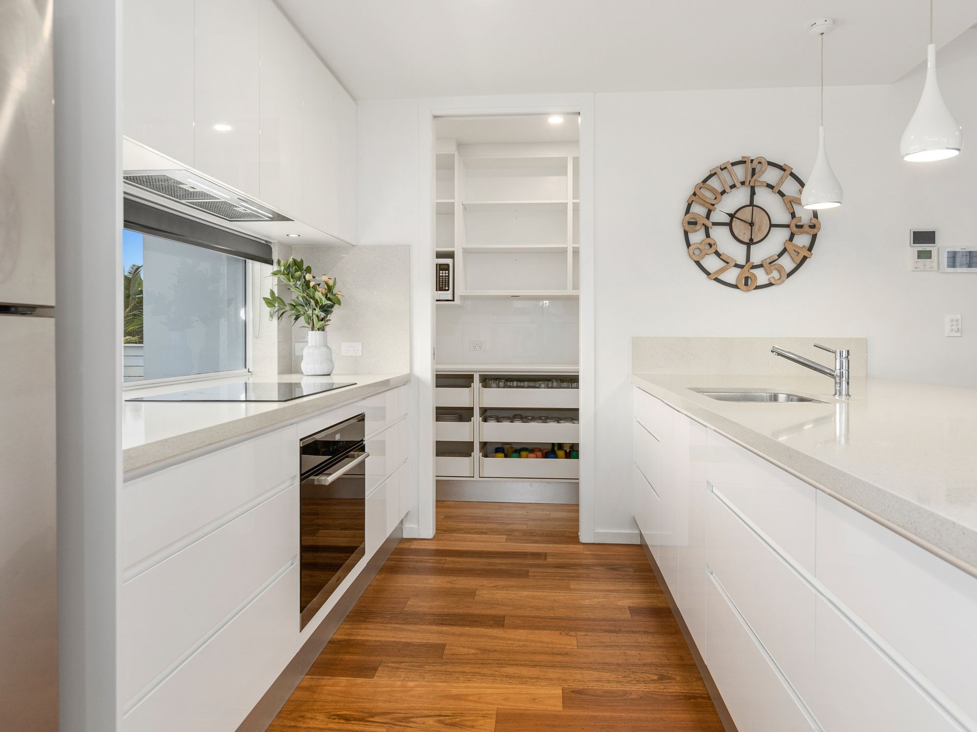 There is a large kitchen including a walk-in butler’s pantry that is fully equipped with all you need, including an electric cooktop, oven, microwave, stainless steel fridge, dishwasher, great-size breakfast bar and ample cupboard space.