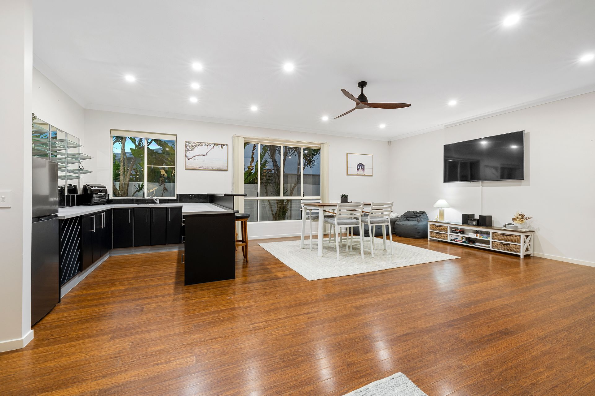 The downstairs kitchenette includes an airfryer, kettle, toaster, coffee pod machine (Nespresso- BYO pods) and milk frother and fridge. Dine downstairs at the 4 seater indoor setting.