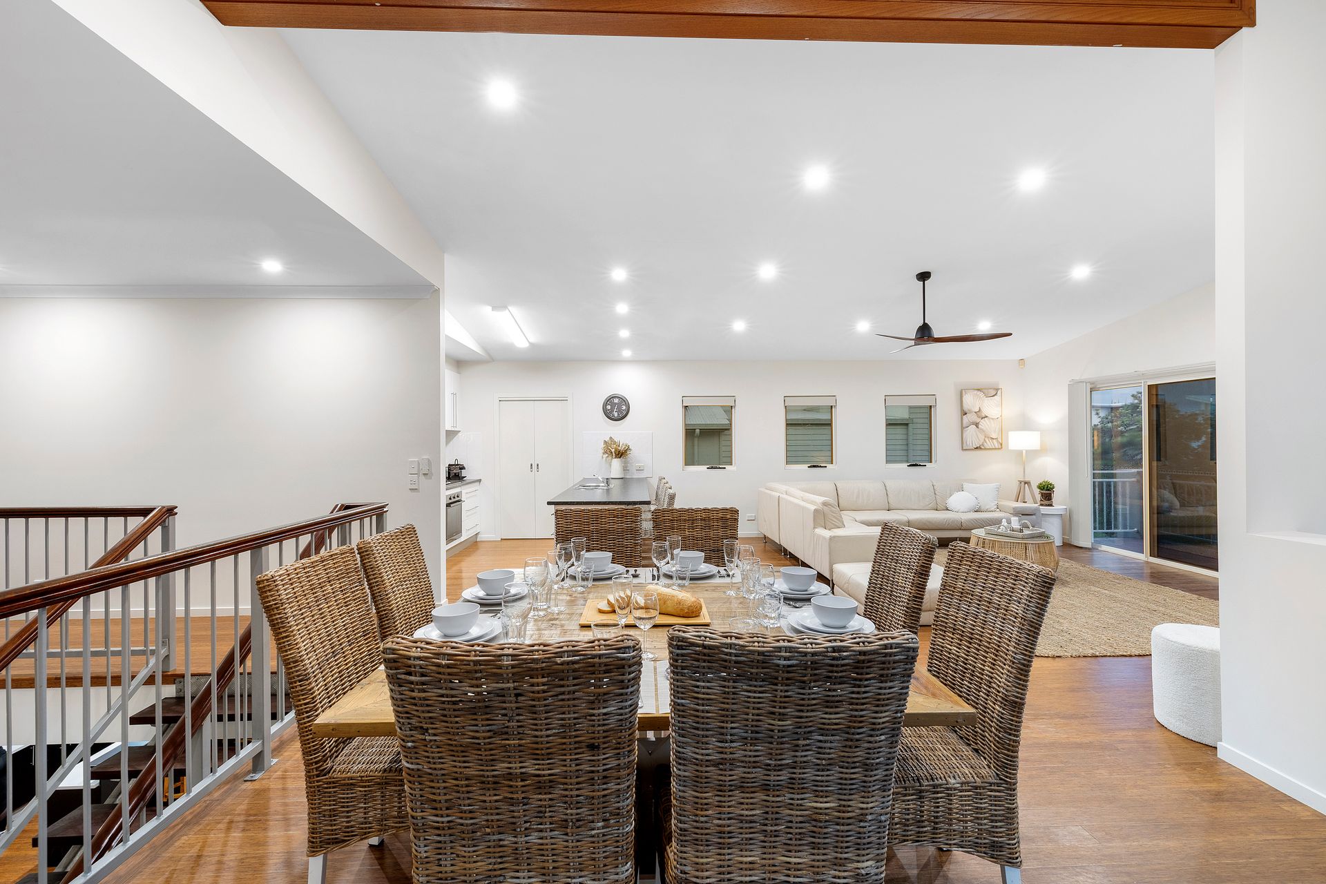 The upstairs kitchen features a fridge, oven, stove, pantry, microwave, kettle, toaster, dishwasher, slow cooker, sandwich toaster, blender, electric frypan, coffee pod machine (Nespresso- BYO pods) and milk frother. The upstairs dining setting seats 8 guests, perfect for family meals. Extra guests can use the breakfast bar bench or additional seating available on the deck. A highchair has been provided for your convenience.