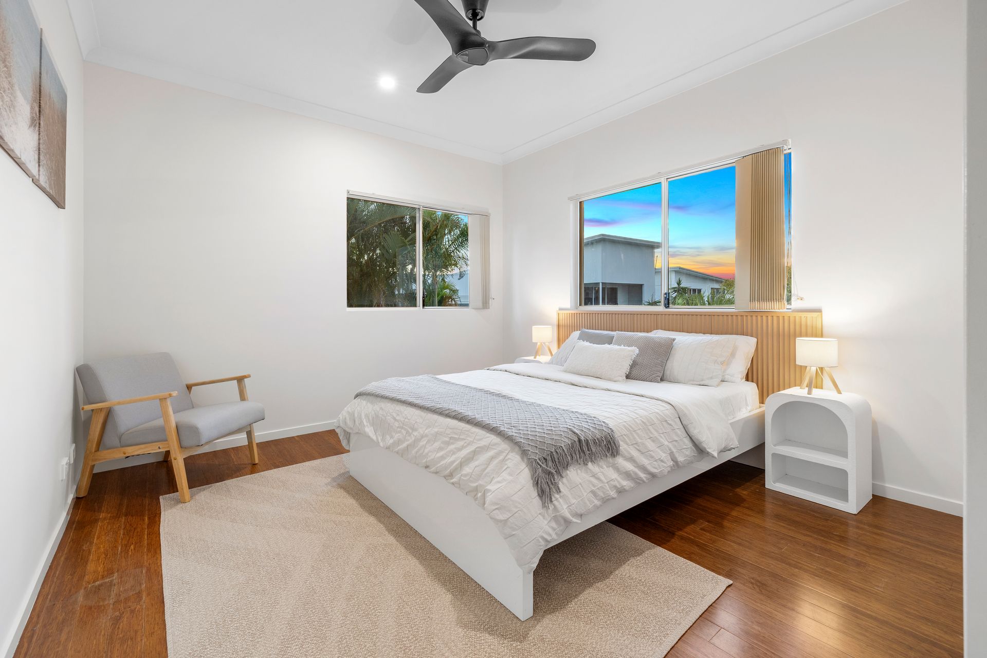 Large downstairs bedroom with direct access to the outdoor patio. Bedroom features a King bed, desk, arm chair, ceiling fan, plus a large ensuite including shower, his-and-hers sinks, separate toilet and large corner bath (no spa). A portacot and fold out single bed is also available for children who wish to be with their parents.