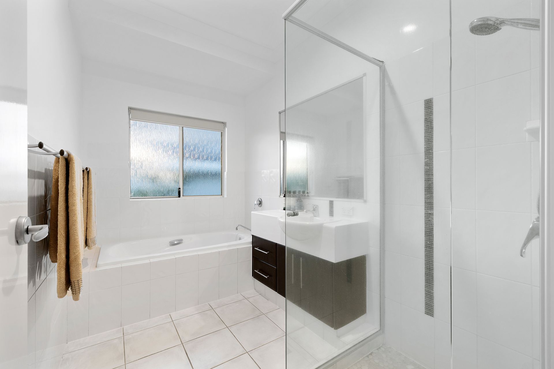 Upstairs bedroom featuring 2x single beds and ceiling fan. Serviced by adjacent upstairs bathroom with shower, bath, sink and separate toilet.