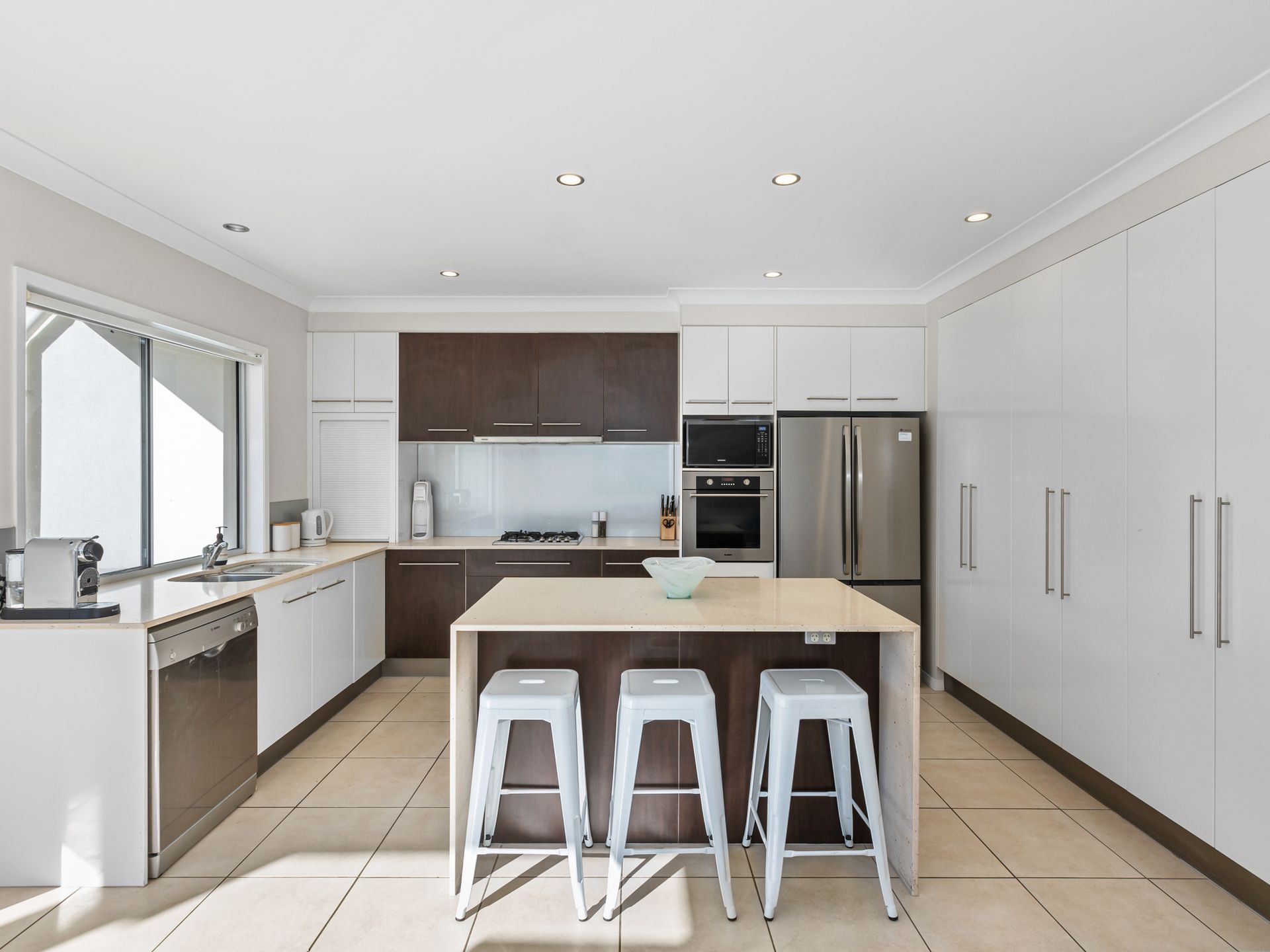 Your fully equipped kitchen includes modern appliances, gas cooktop, oven, microwave, dishwasher, Nespresso coffee machine and breakfast bar.