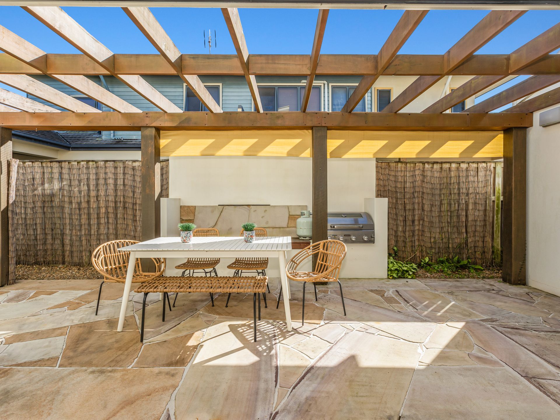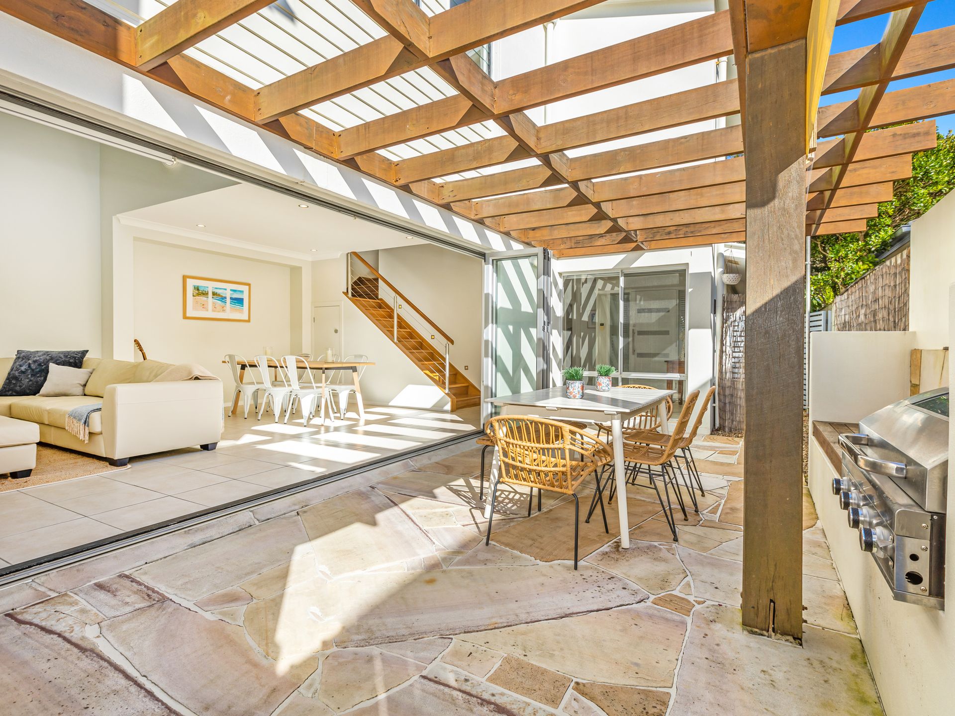 Your first living area features a lounge suite, smart TV, 6-seater dining table and opens out to the covered entertaining area. The spacious area is set up with another outdoor dining setting and BBQ.