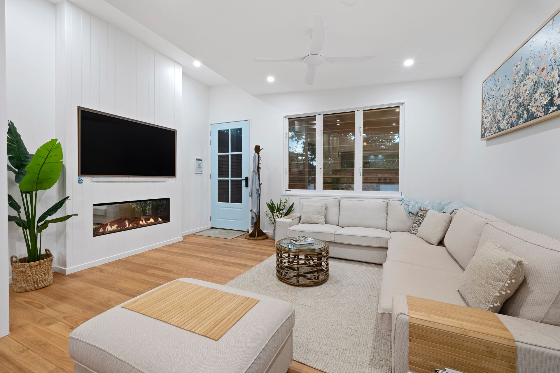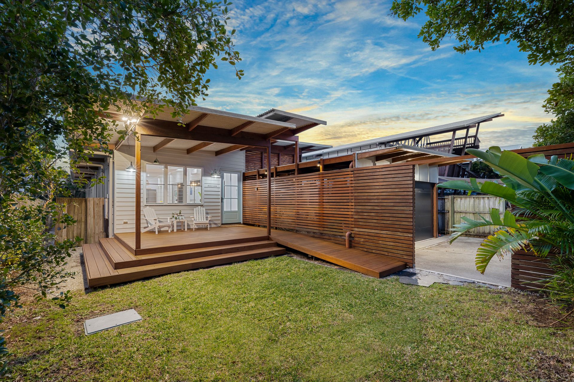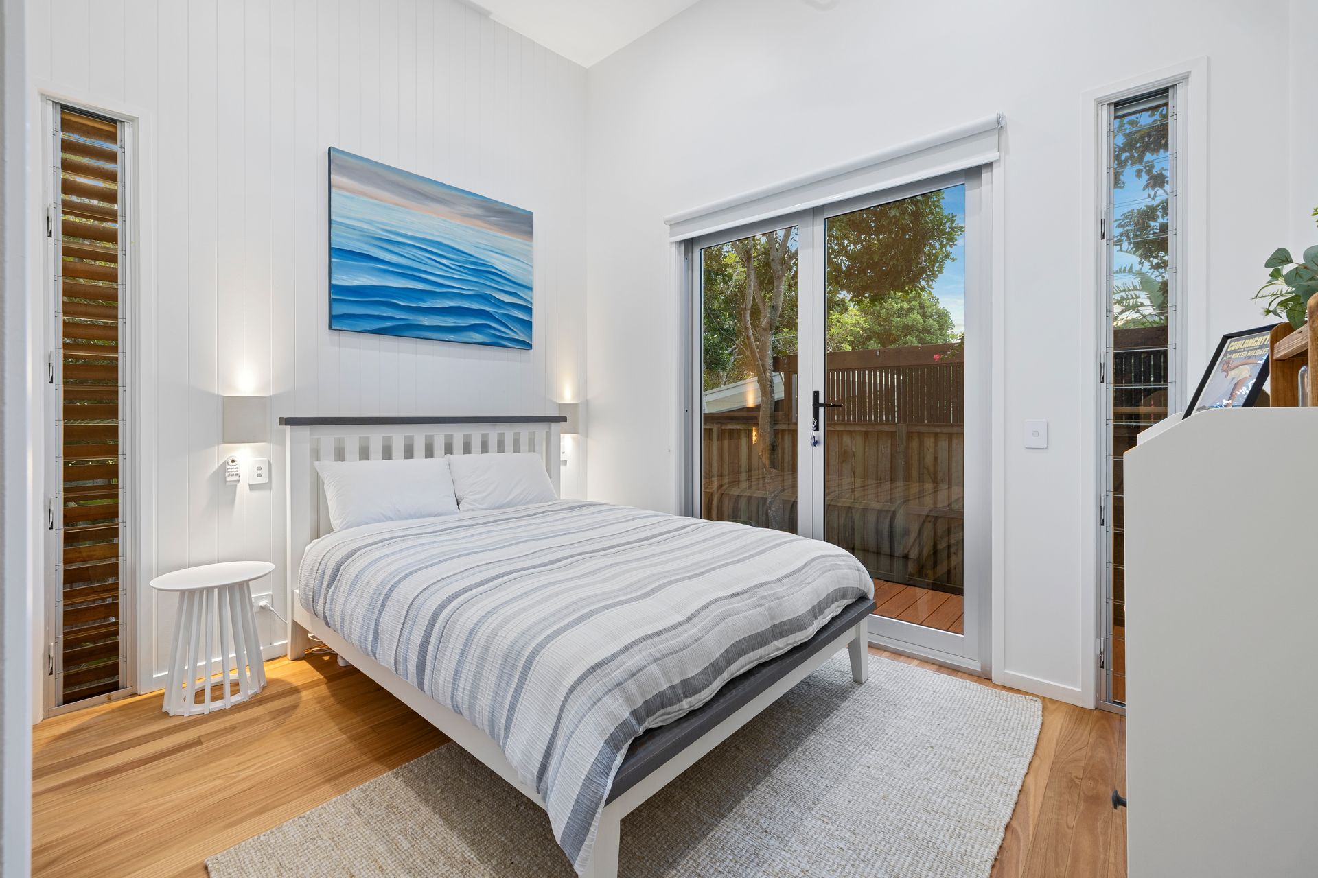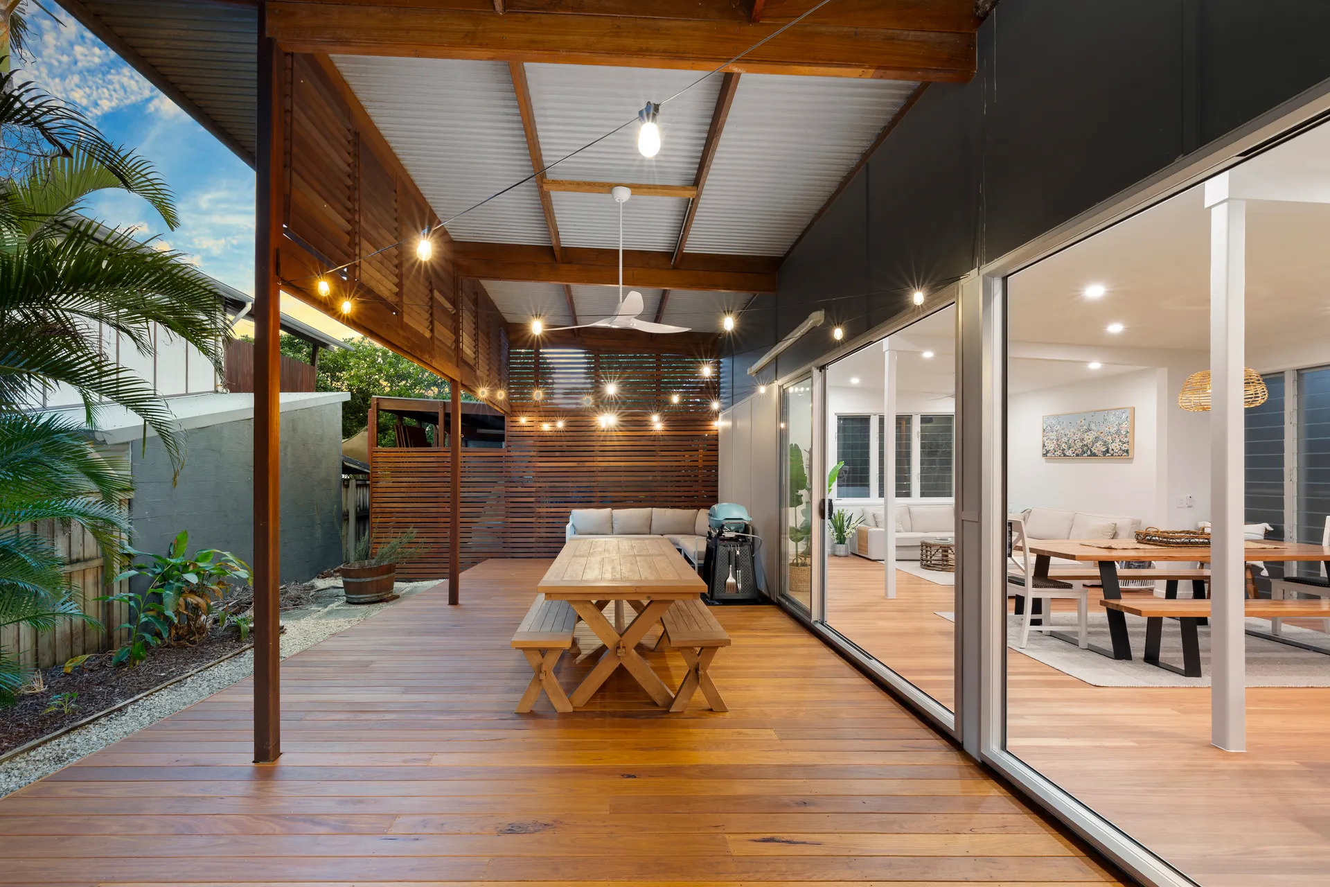 The generous outdoor deck sets the perfect scene for holiday memories, accessed via the triple glass sliders which bring the outside in. Whether it’s whipping up BBQ family meals, enjoying a morning coffee while listening to the ocean sounds, or relaxing on the comfy outdoor couch with your favourite book, this deck has the space. The high ceilings and brand-new timber decking add a premium feel to this special outdoor space, complete with ceiling fan. Festoon lights create a gorgeous ambience for your holiday evenings on the deck, soaking up family time and sunset skies. The ample outdoor table offers plenty of space for alfresco meals.