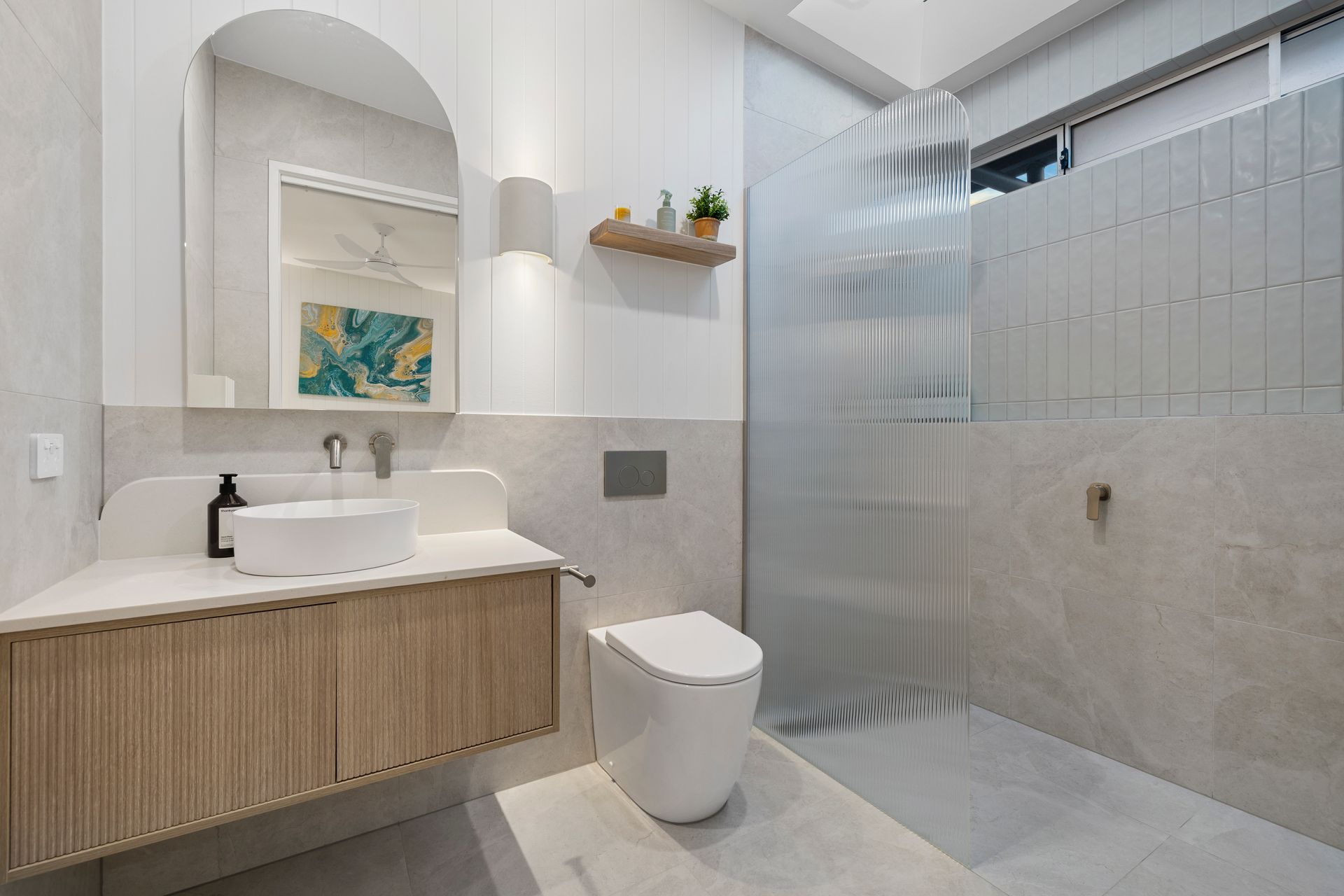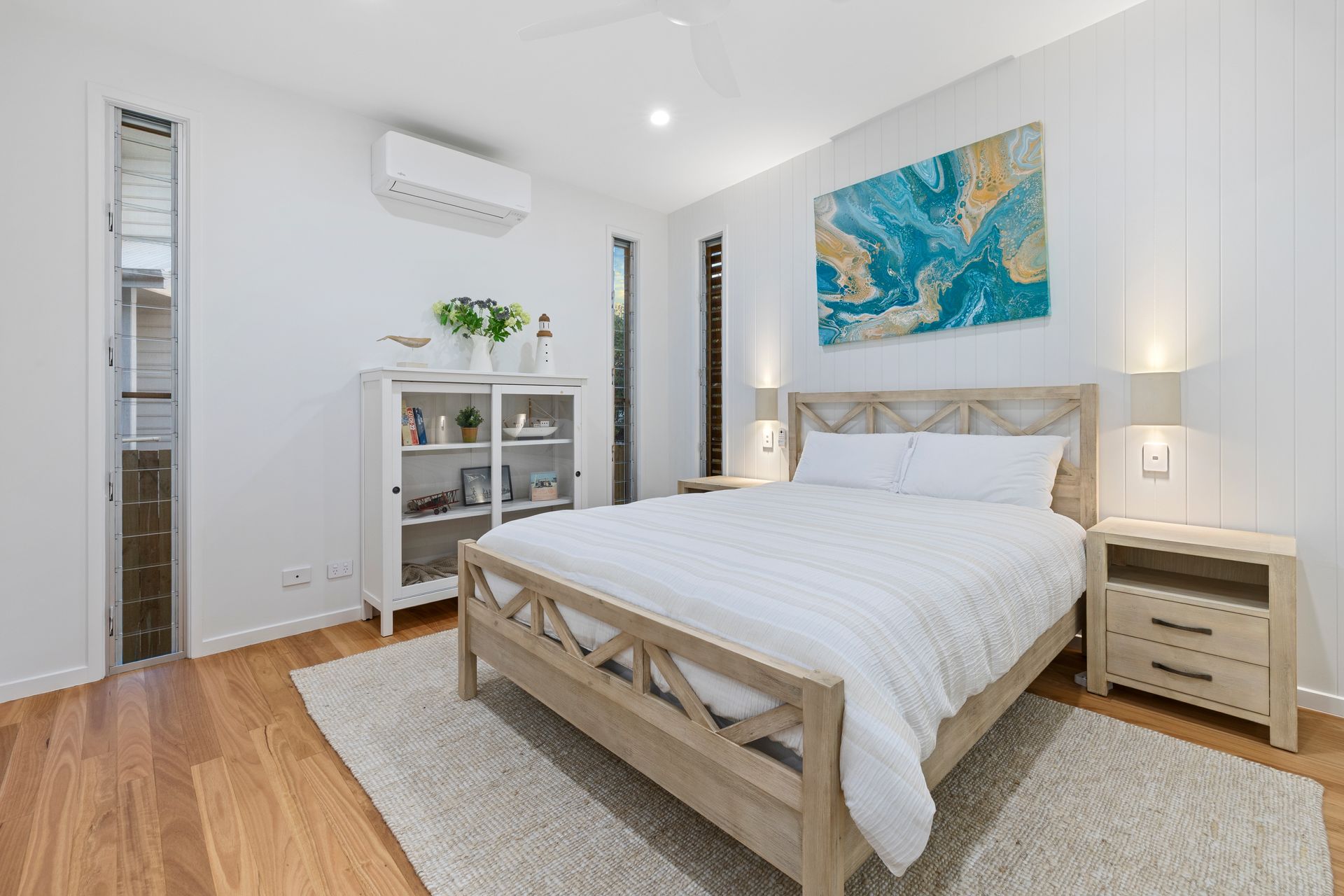 The master bedroom features a Queen sized bed, ceiling fan and split system airconditioning for your comfort. The attached ensuite is beautifully designed and features a skylight above the spacious shower, plus a toilet and sink for your convenience. The heated towel rack adds a touch of luxury, thoughtfully selected for those cooler evenings.