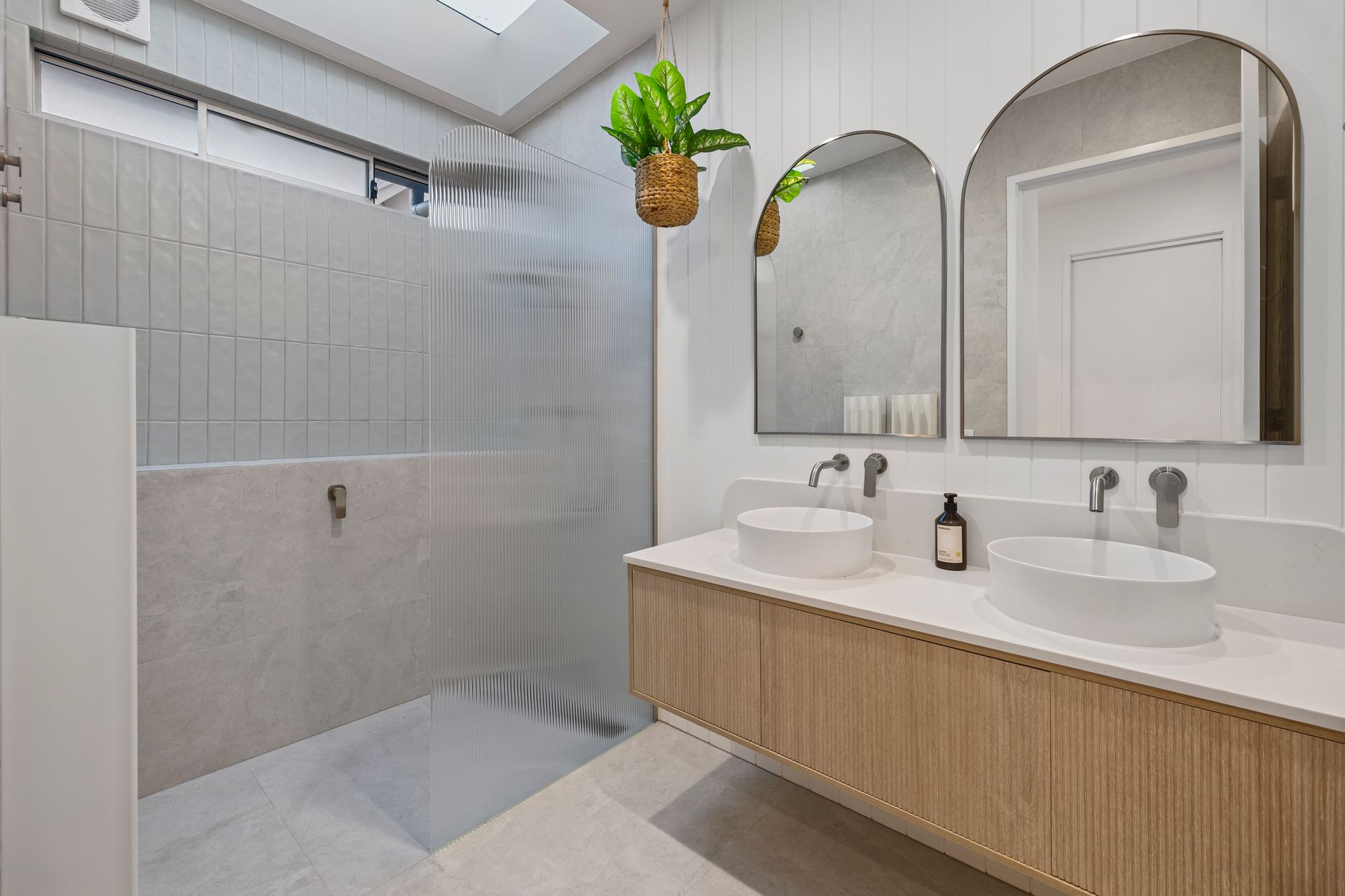 The main bathroom is beautifully illuminated by a skylight above the spacious shower, which features both a rain shower head and an adjustable handheld option. This natural light highlights the room’s stylish design, complete with twin sinks and a heated towel rack. The separate toilet is conveniently located adjacent the bathroom. The laundry features a washing machine and dryer, internal vend-a-line for clothes airing, plus iron and board for your convenience.