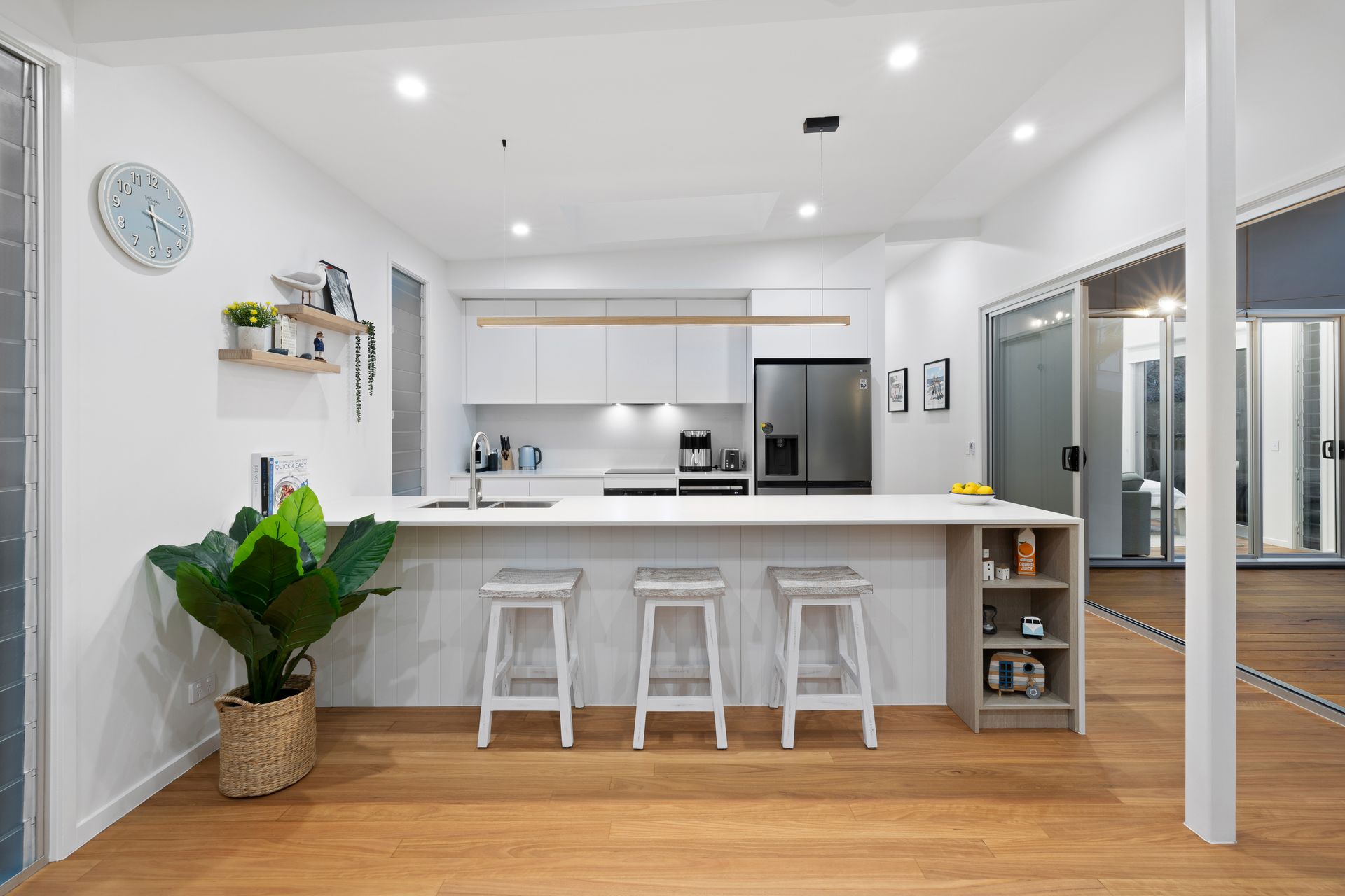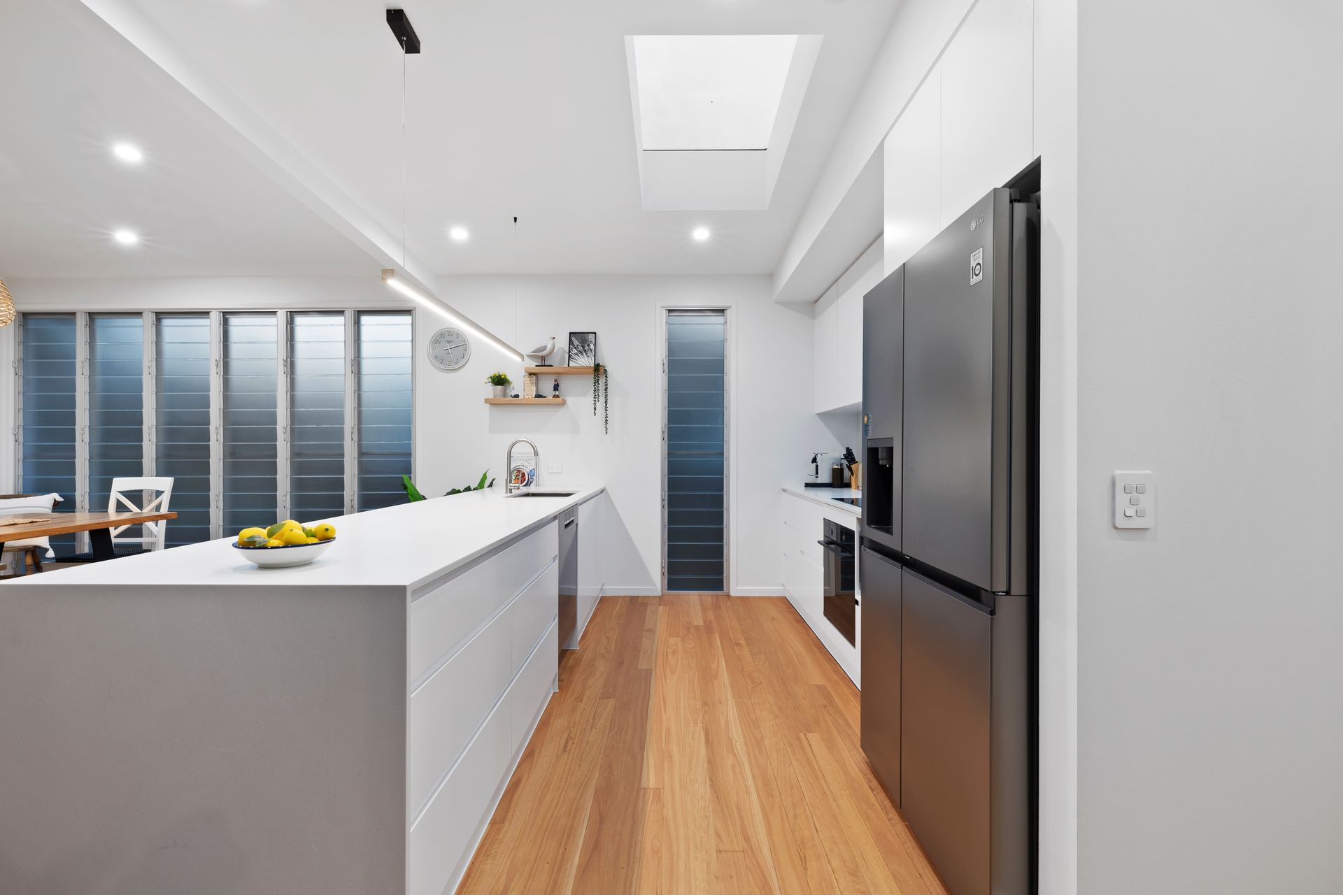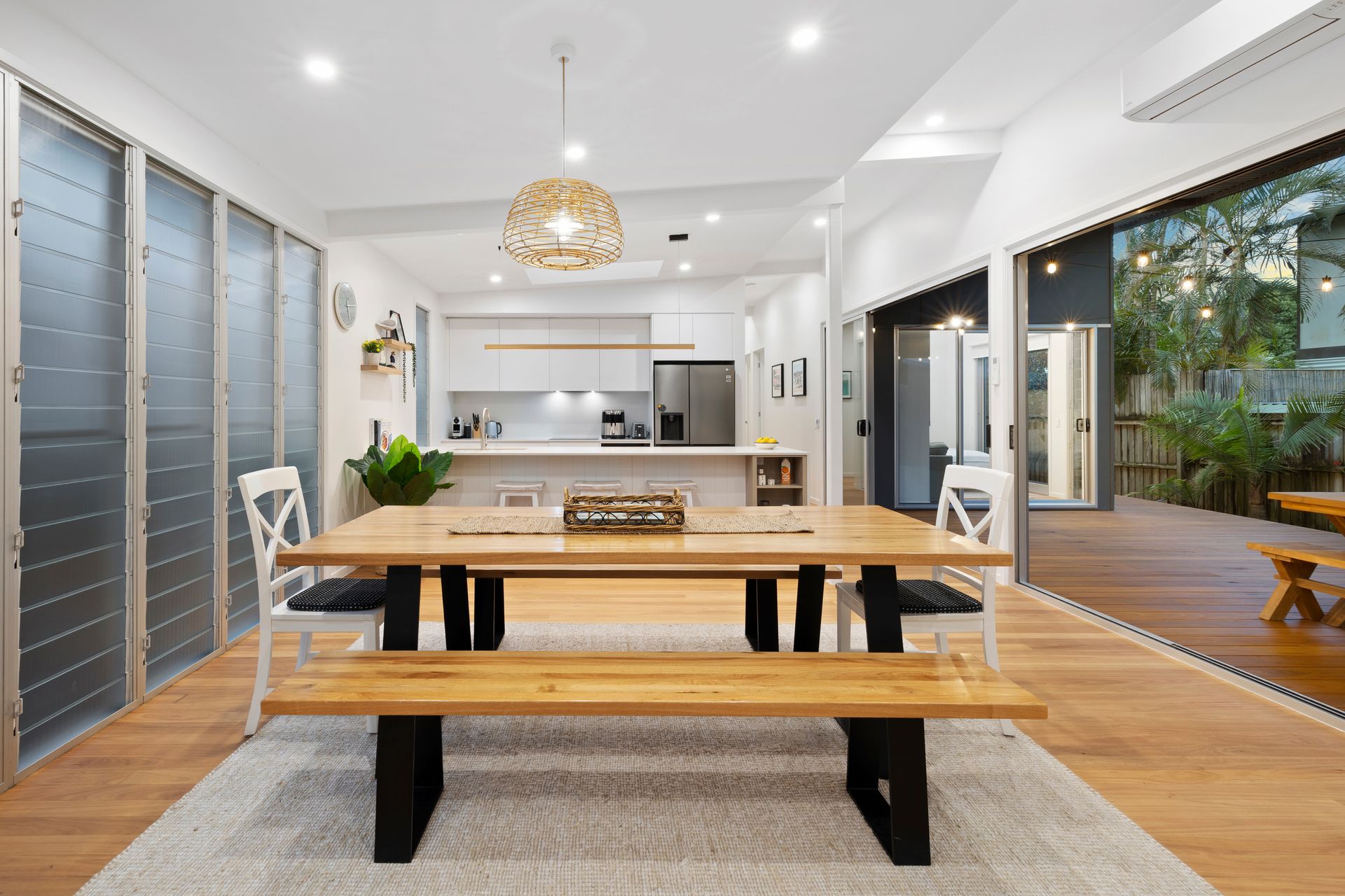The frosted louvres provide privacy or a beautiful breeze, creating a seamless connection between the kitchen and dining areas while enhancing both with soft natural light and airflow. The timber dining table is great for fitting the whole family for special occasions or group meals. Enjoy a light meal or connecting with your loved ones over the breakfast bar, which includes 3 bar stools.