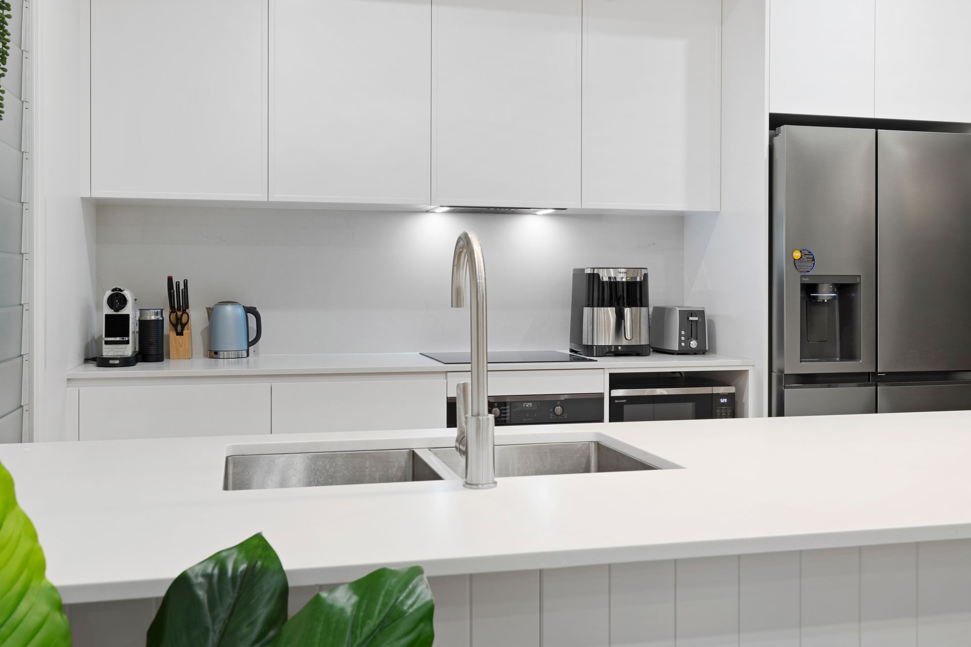 The streamlined kitchen includes all of the essentials for your cooking needs away from home, including a large French-door fridge with water and craft ice maker, microwave, kettle, toaster, oven, induction cooktop, dishwasher, Delonghi Nespresso pod machine with milk frother, and airfryer. A skylight overhead fills the space with natural light, creating a bright and inviting atmosphere as you try your hand at something new crafted from one of the many supplied cookbooks.