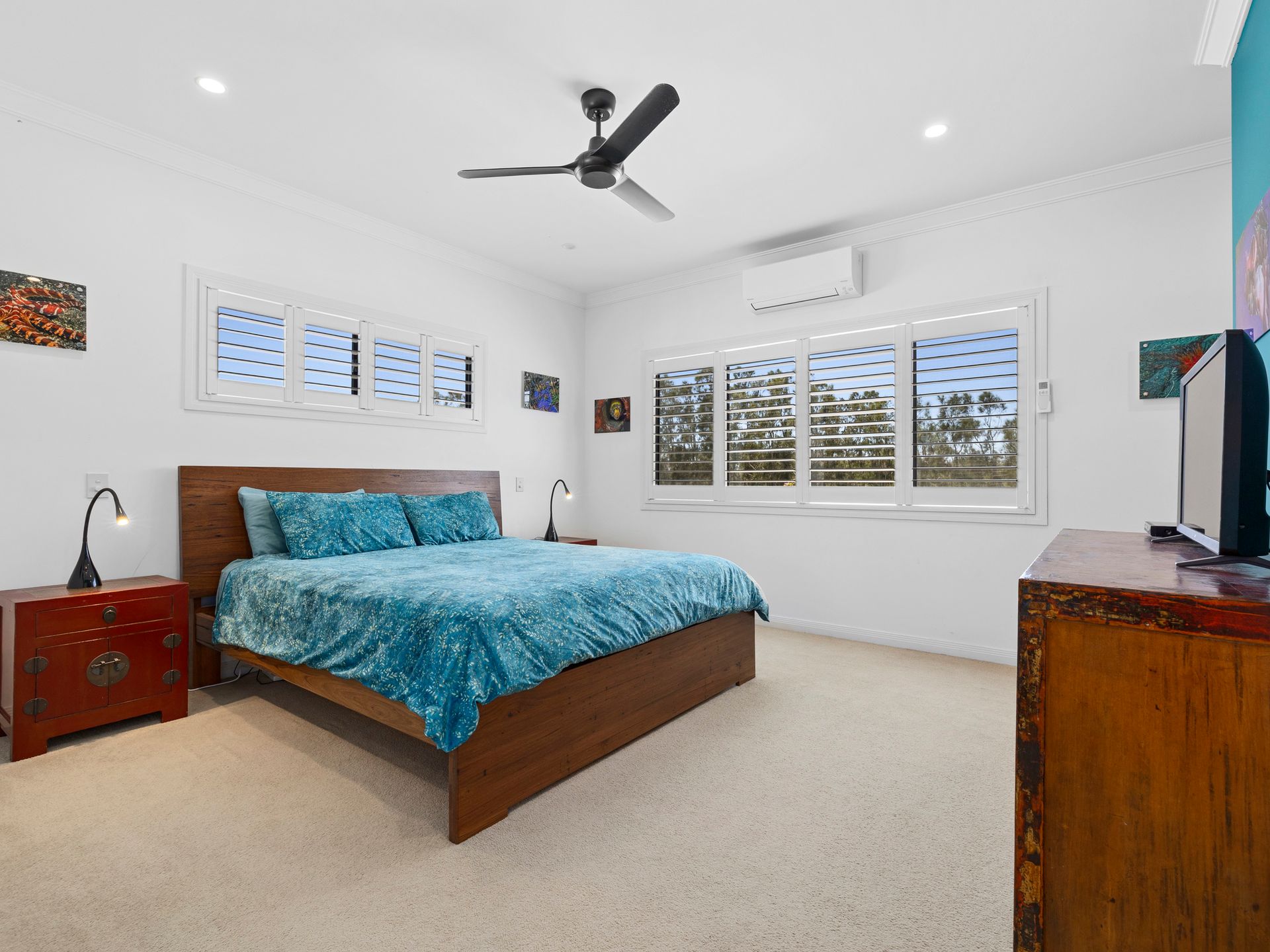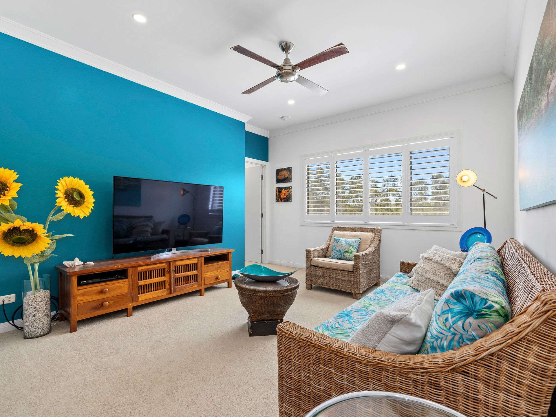 The master bedroom is upstairs and has a king sized bed, walk in robe, ensuite, ceiling fan and air conditioning. Next door is a small private lounge with a 65 inch TV and DVD.