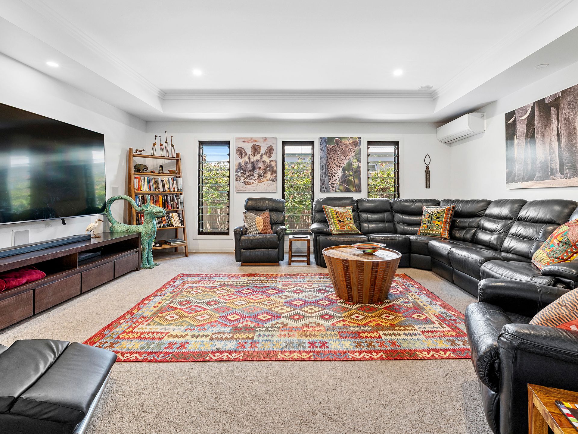 The main living area has a dining setting for 8 as well as a cane lounge suite. On one side is a large media room, with a 65 inch TV (Prime Video included) and DVD. A wide variety of DVDs are available. There is a well stocked bookcase for holiday reading as well as games & puzzles for all ages.