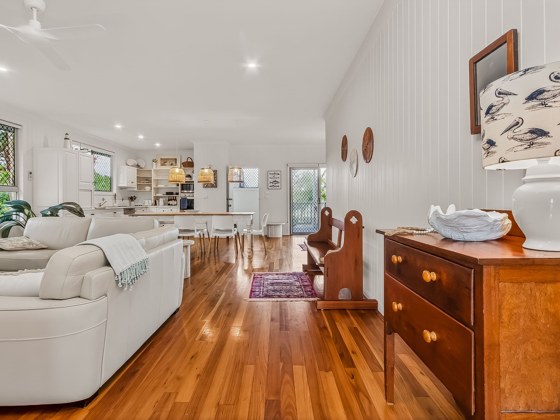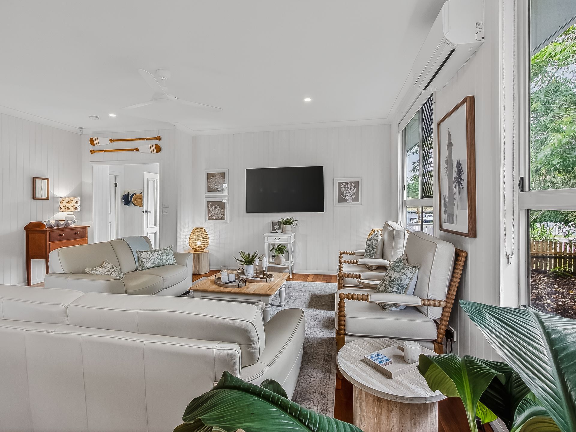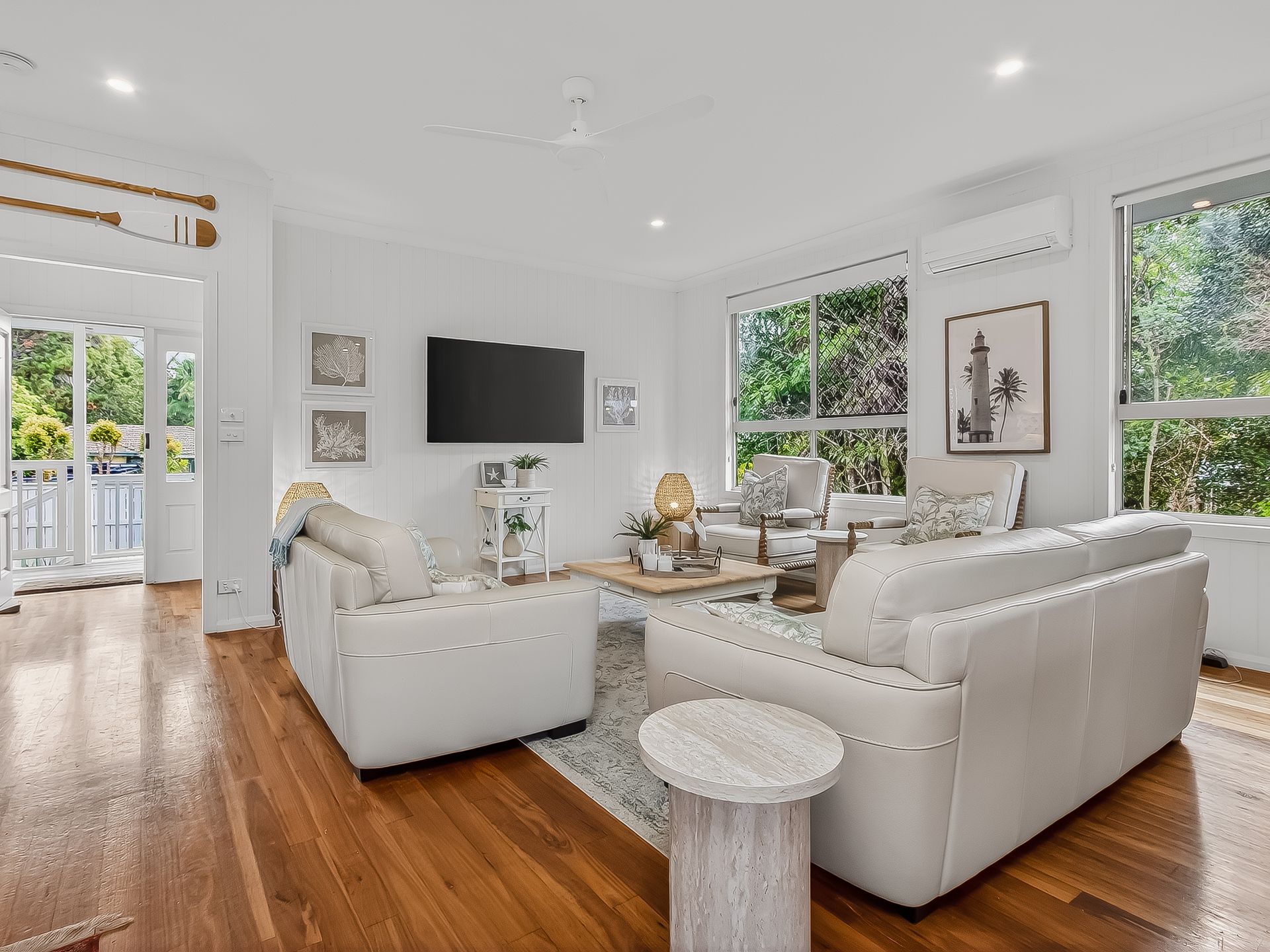 The wrap-around, covered balcony catches the coastal breezes and adjoins 2 upstairs bedrooms. This space is ideal for enjoying lazy afternoons with your favourite drink in hand. The beautifully styled upstairs living area features timber floors, leather lounges, Smart TV, AC and ceiling fan.