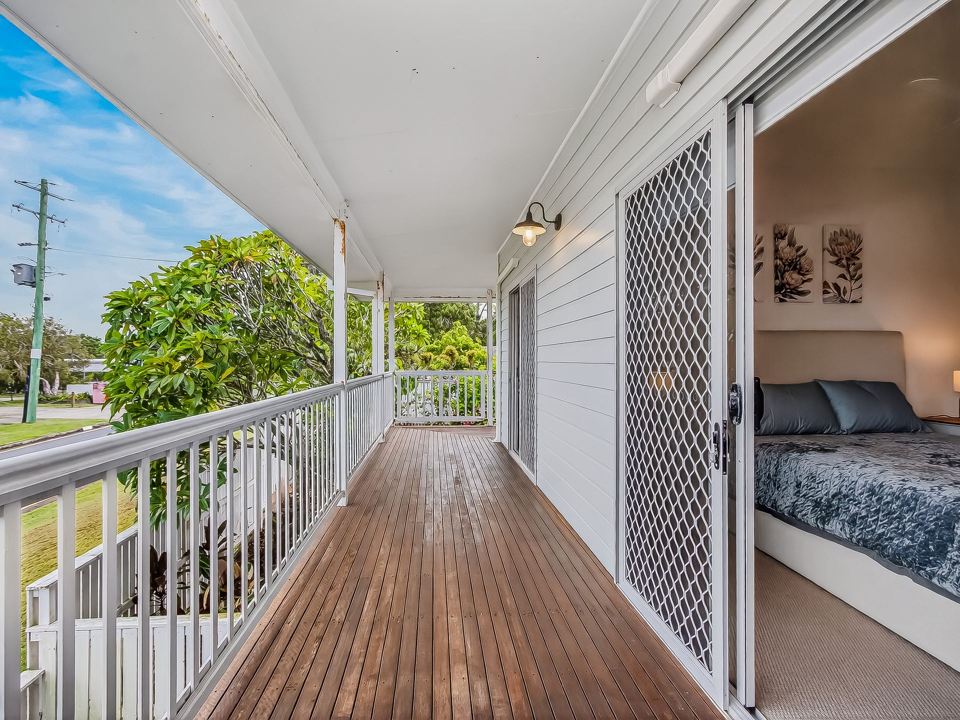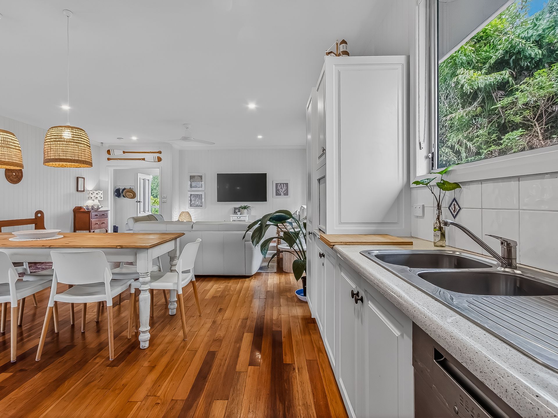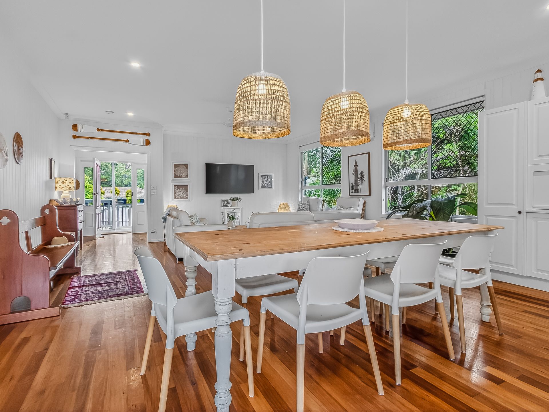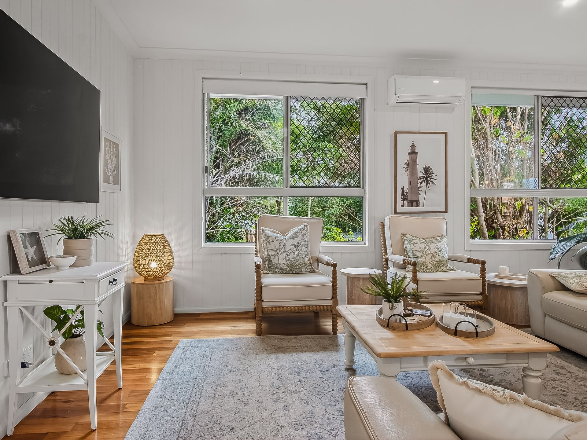 The wrap-around, covered balcony catches the coastal breezes and adjoins 2 upstairs bedrooms. This space is ideal for enjoying lazy afternoons with your favourite drink in hand. The beautifully styled upstairs living area features timber floors, leather lounges, Smart TV, AC and ceiling fan.