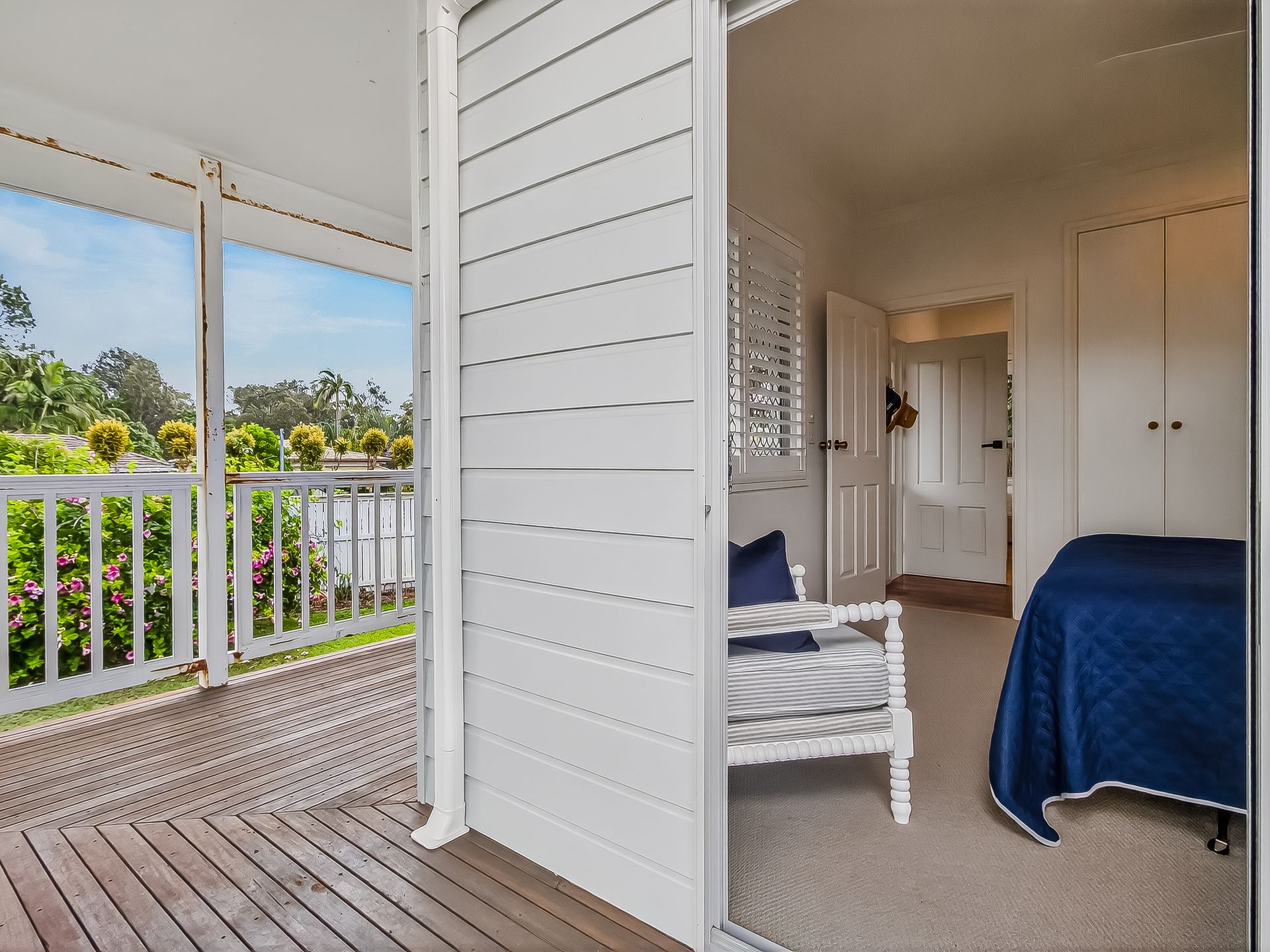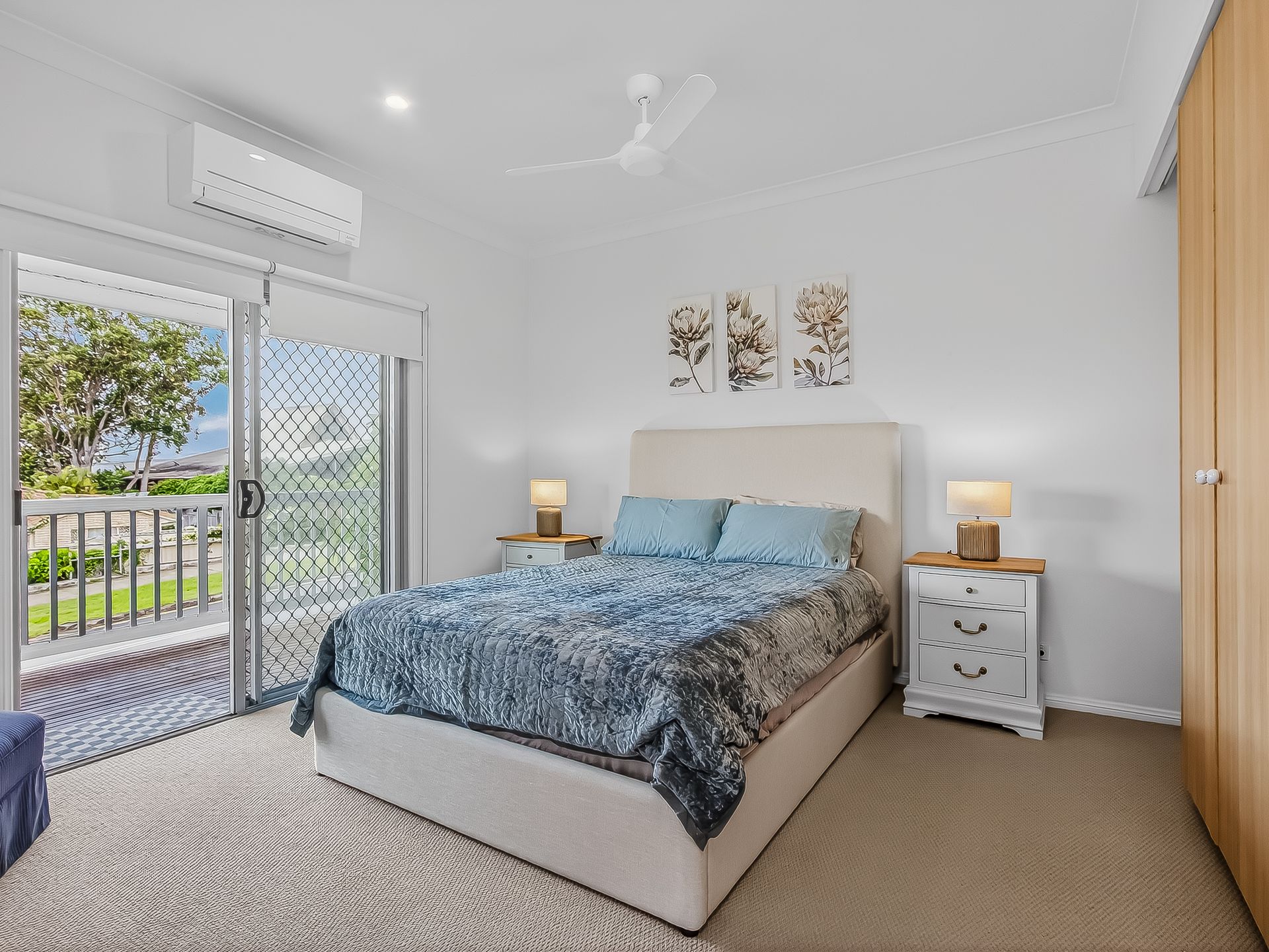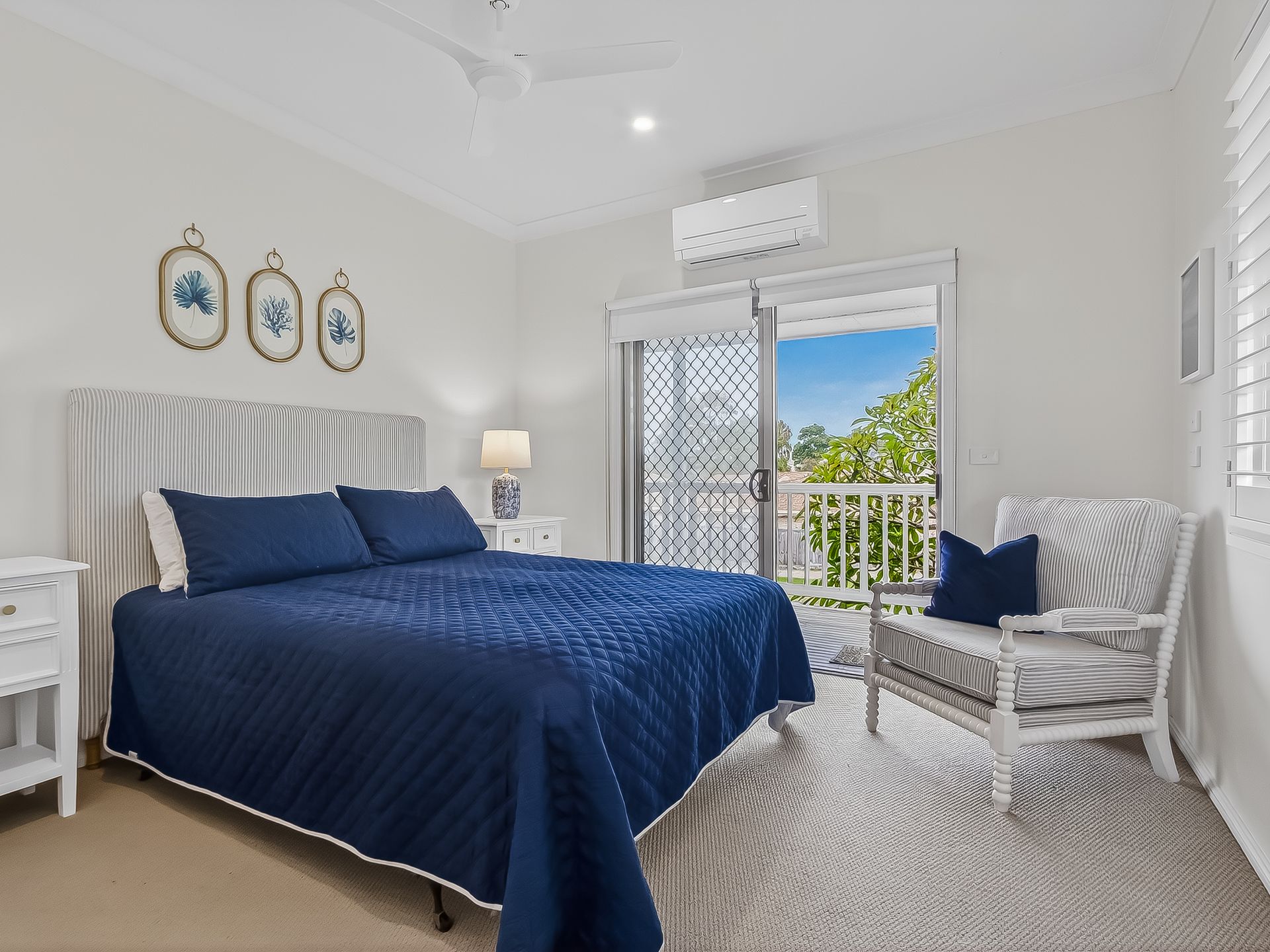 • Bedroom 1 features a Queen bed, AC, ceiling fan, balcony access and an armchair.