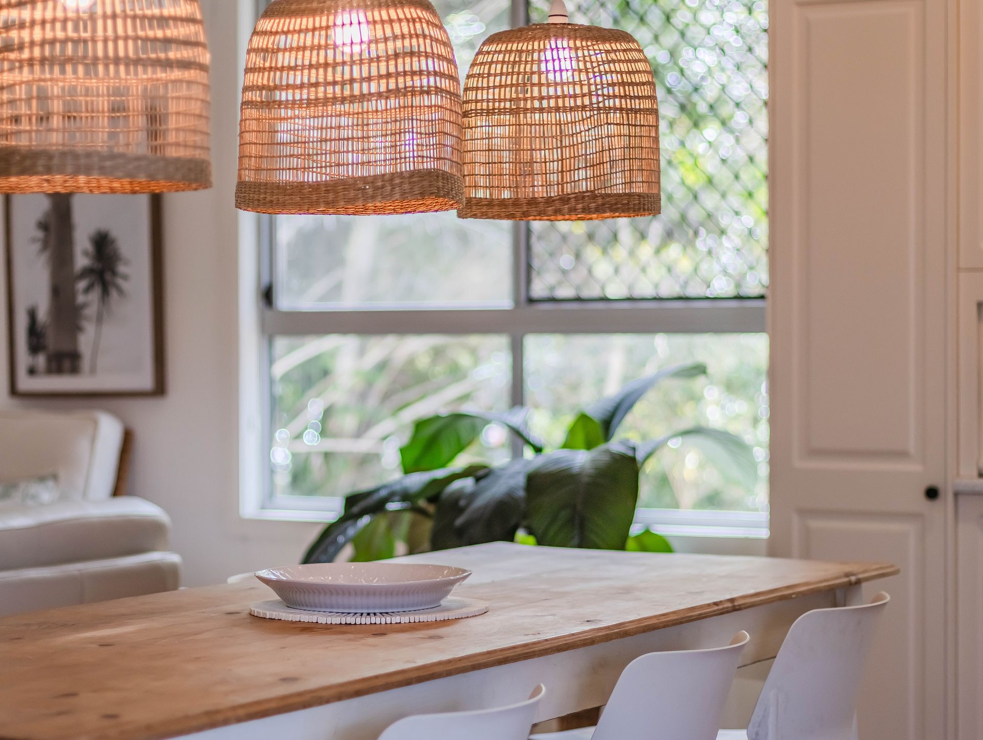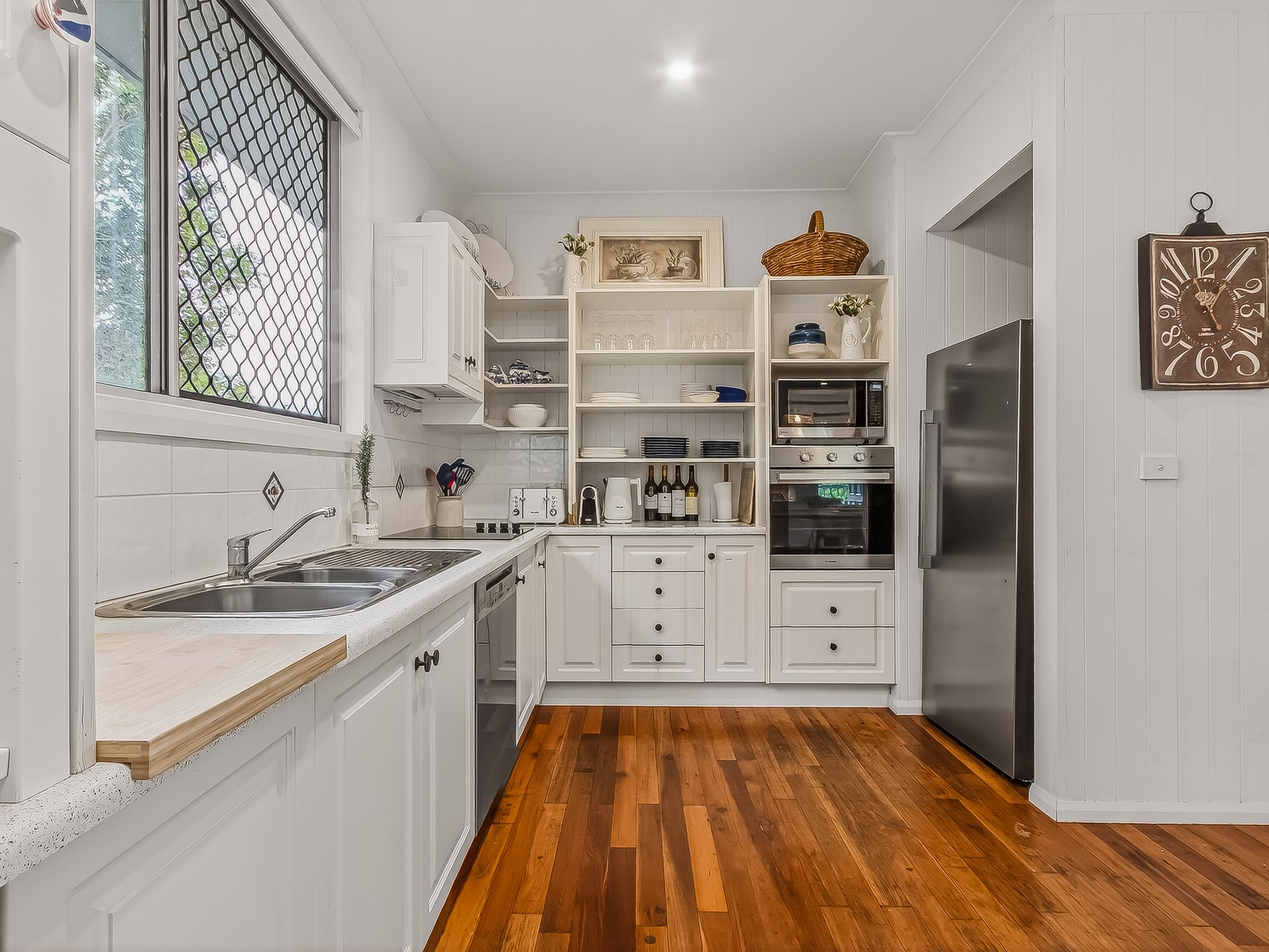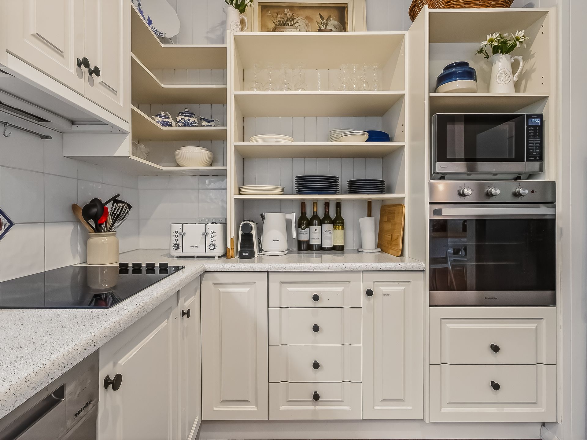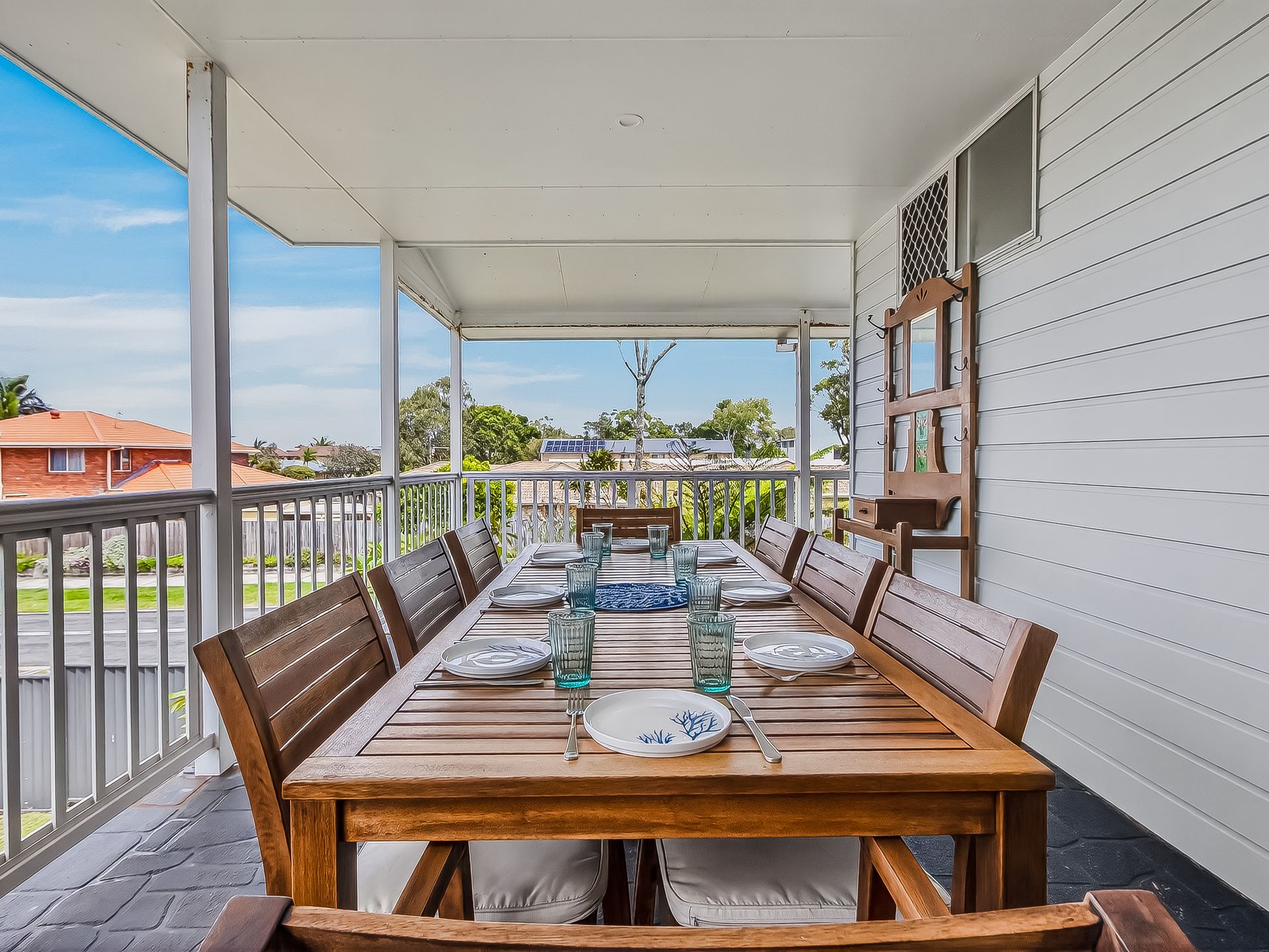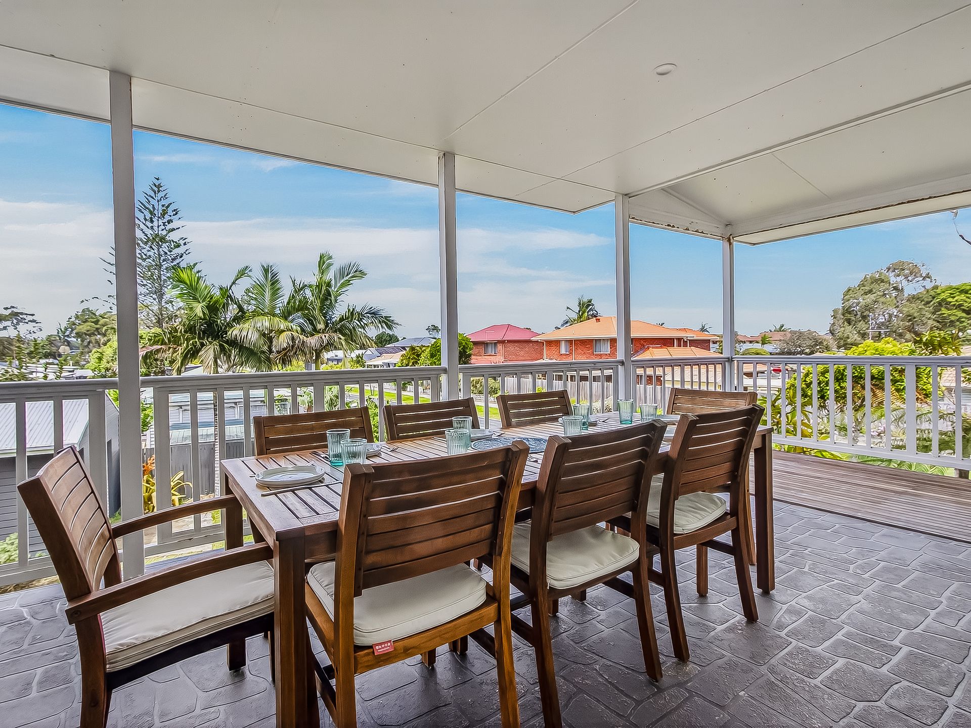 The kitchen contains all the essentials for preparing family meals on holidays, including fridge, oven, stove, dishwasher, toaster, kettle, microwave and coffee pod machine. The 8-seater dining table adjacent provides a relaxed space for family mealtime. Extra guests can sprawl out onto the 8-seater outdoor setting on the covered balcony. A BBQ has been provided for delicious holiday meals.