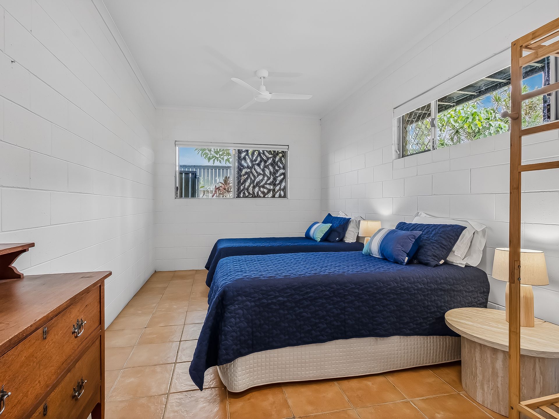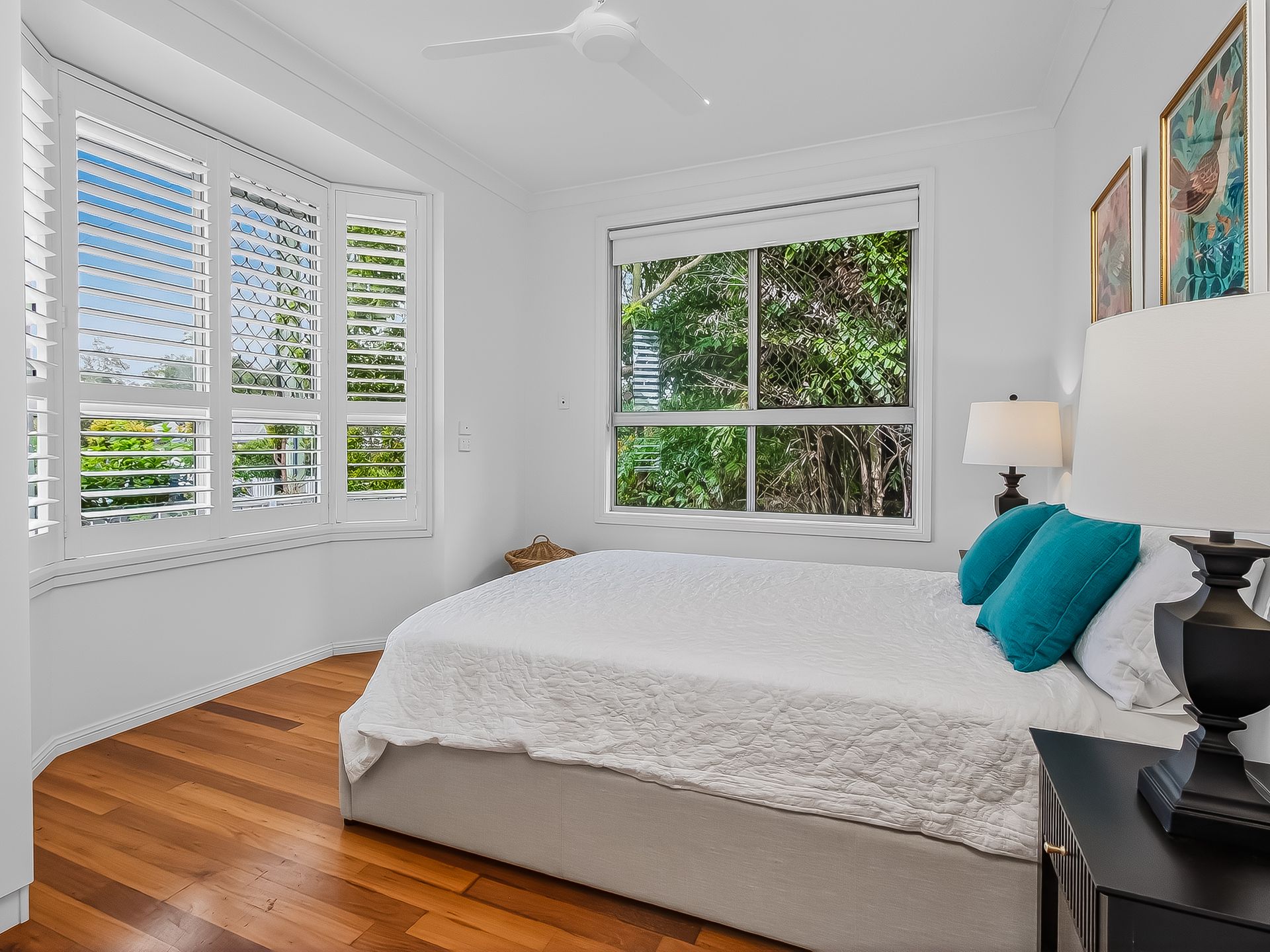 • Bedroom 3 features a Queen bed and ceiling fan.