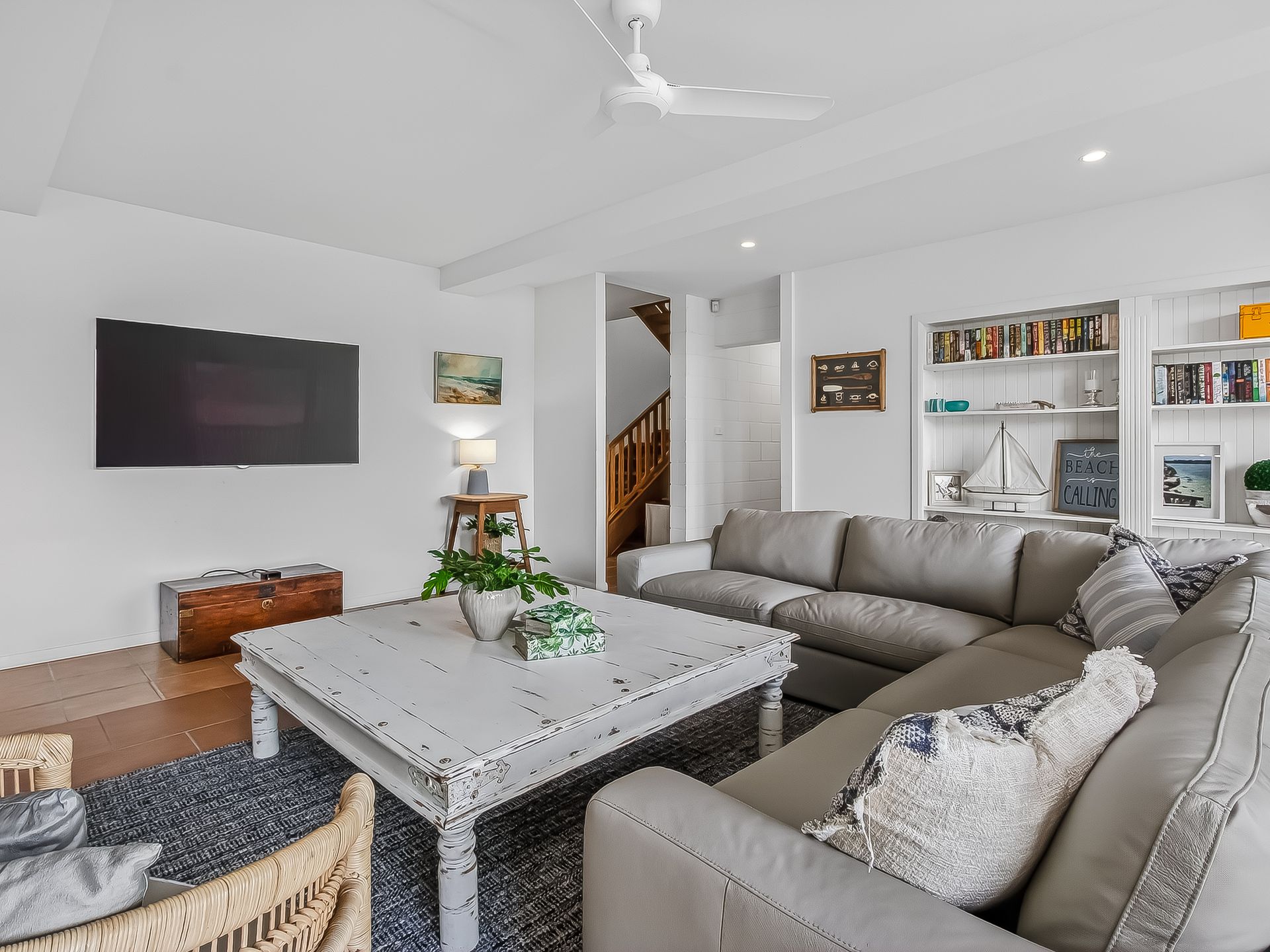 The downstairs living room features an L-shaped leather lounge, plenty of books, a Smart TV, Apple TV and ceiling fan.