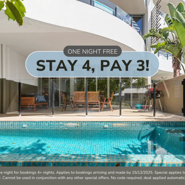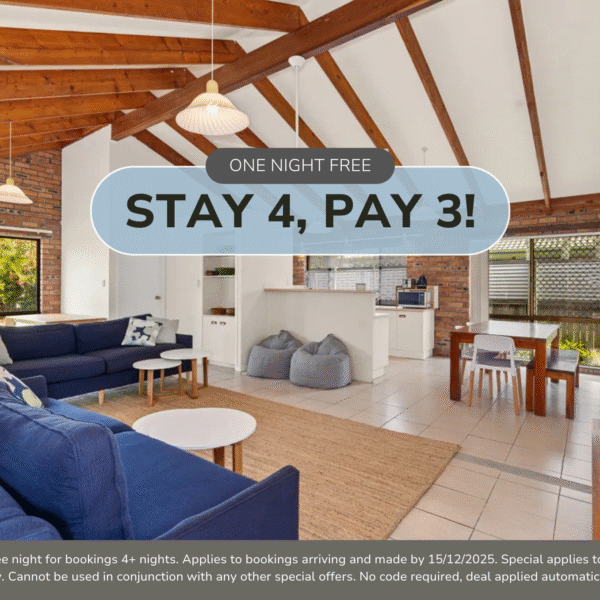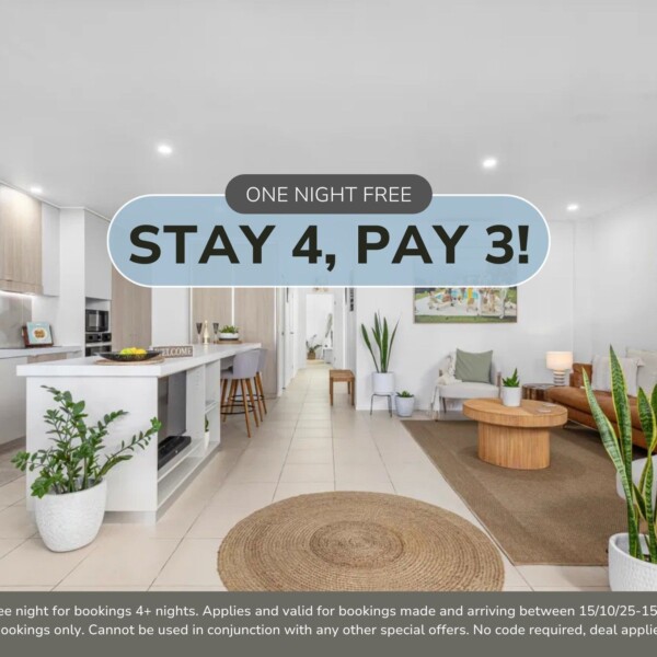 Receive one free night for bookings 4+ nights. Applies to bookings arriving and made by 15/12/2025. Special applies to new bookings only. Cannot be used in conjunction with any other special offers. No code required, deal applied automatically.